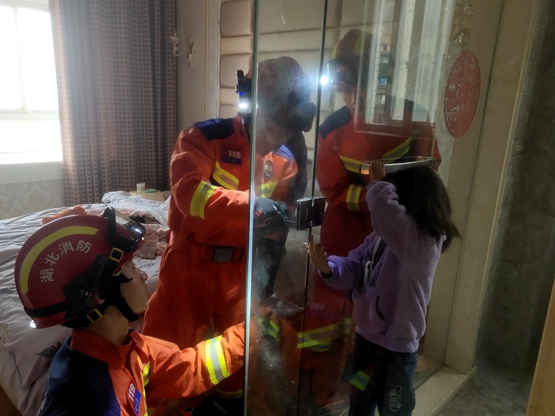 随后,消防救援人员帮助女童家把拆下来的合页安装好后收整器材归队。
