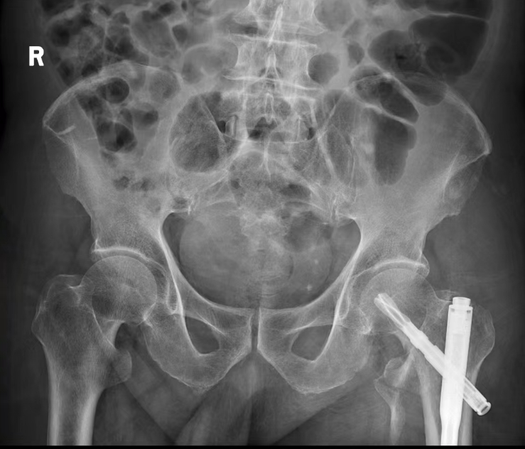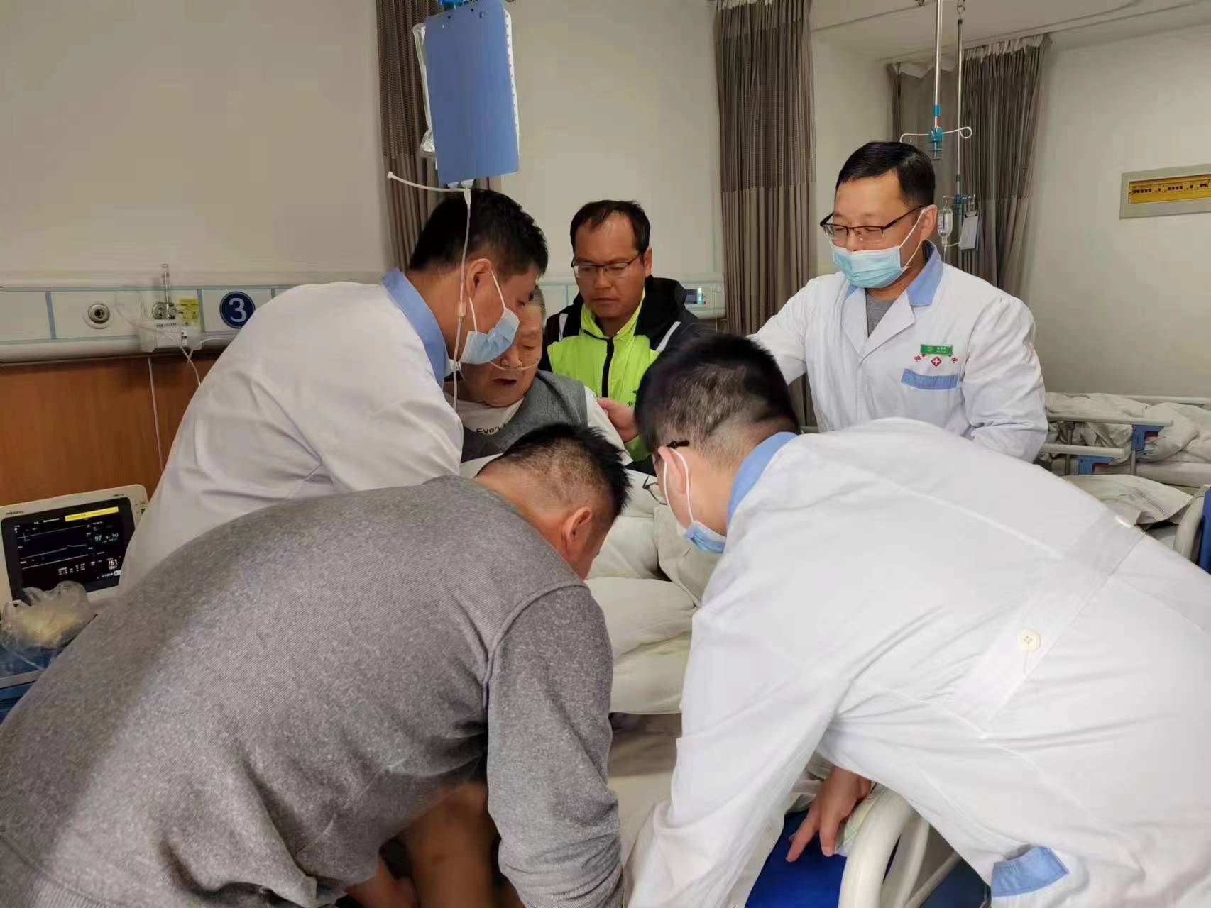 4月24日,86岁的肖爷爷在家不慎滑倒,左侧身体着地,左髋部剧烈疼痛不能活动,家属立即拨打120急救电话送往医院急诊科,急诊检查诊断为“左侧股骨粗隆间骨折、脑梗死后遗症、高血压、双侧膝关节炎”。骨科医生石博接诊后立刻上报医务部,当即对患者开放了绿色救治通道快速完成各项检查,运用多学科联合诊疗MDT工具,入院当日即完成了麻醉科、神经内科、心内科、ICU等多个相关学科的会诊支持,一致同意为患者实施手术,尽快摆脱骨折-卧床-基础病及合并症进行性加重-死亡的恶性循环,最大程度提高患者的生存率。当时肖爷爷和家人犹豫不决,不手术的话疼痛和活动不便难以忍受,而手术又担心年纪大合并症多导致手术风险大,难以抉择。经过骨二病区沈其孝主任和连一医援阳骨科副教授霍永峰的耐心沟通,反复权衡利弊后最终决定积极手术治疗。
