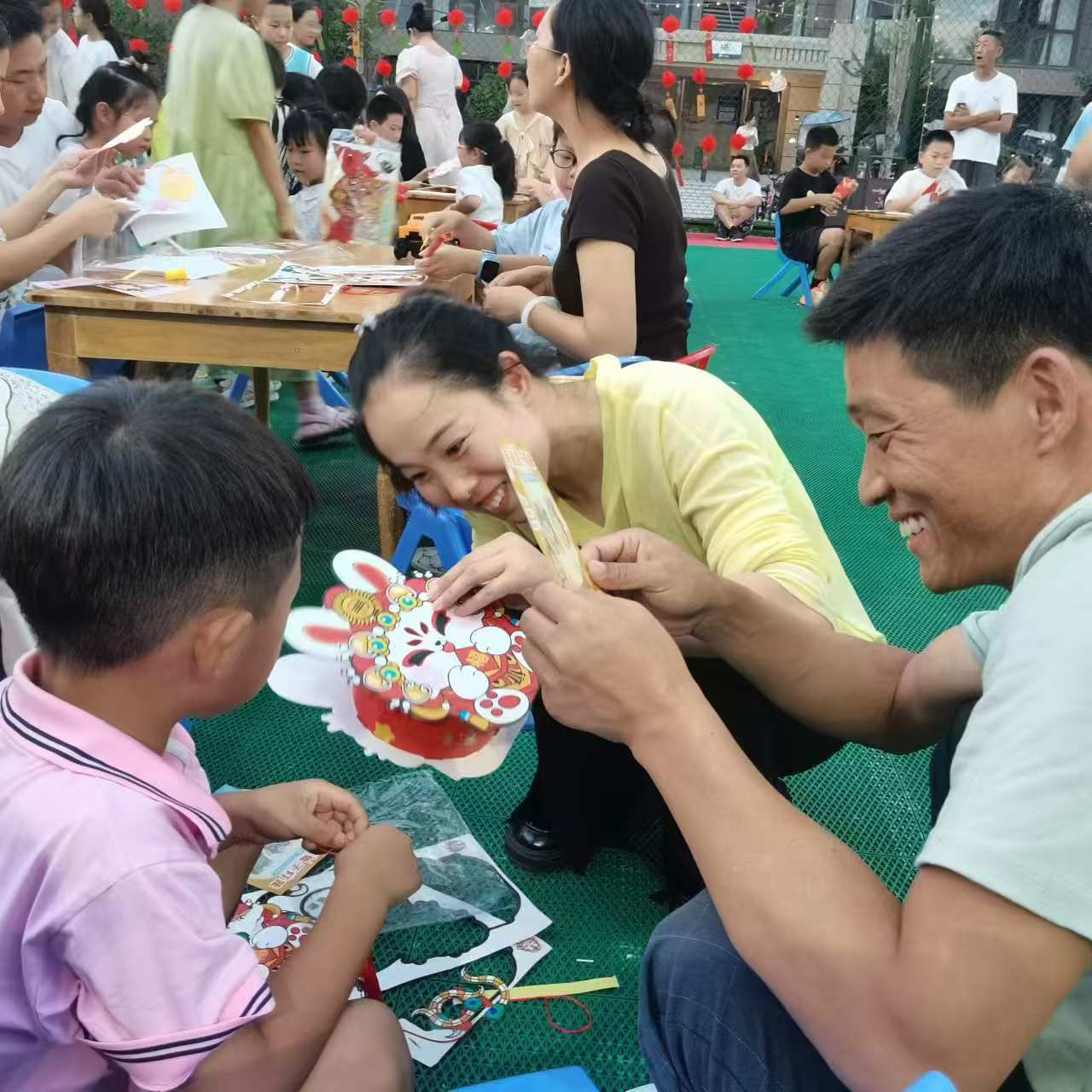 16日下午,在碧桂园小区开展了一场别开生面的兔子灯制作和猜灯谜活动。活动在热心居民公益街舞教学中开场,动感的音乐,明快的节奏,一下就点燃了现场。接着志愿者们将一盏盏色彩明丽、带有灯谜的灯笼挂好,大家相聚在花灯下,有的望着灯谜认真思索;有的豁然开朗开心地拿着谜面去兑换小礼品,有的吃着爆米花、喝着饮料随意溜达,有的闲话家常,其乐融融。那边,志愿者分发兔子灯的制作材料,鼓励居民朋友们着手制作。“先把灯架展开,再把画纸贴在对应位置...”家长一边指导着小朋友一边配合组装,那诞生的一只只“小兔子”,活灵活现、栩栩如生,既温暖和谐了亲子关系也点亮了中秋夜。