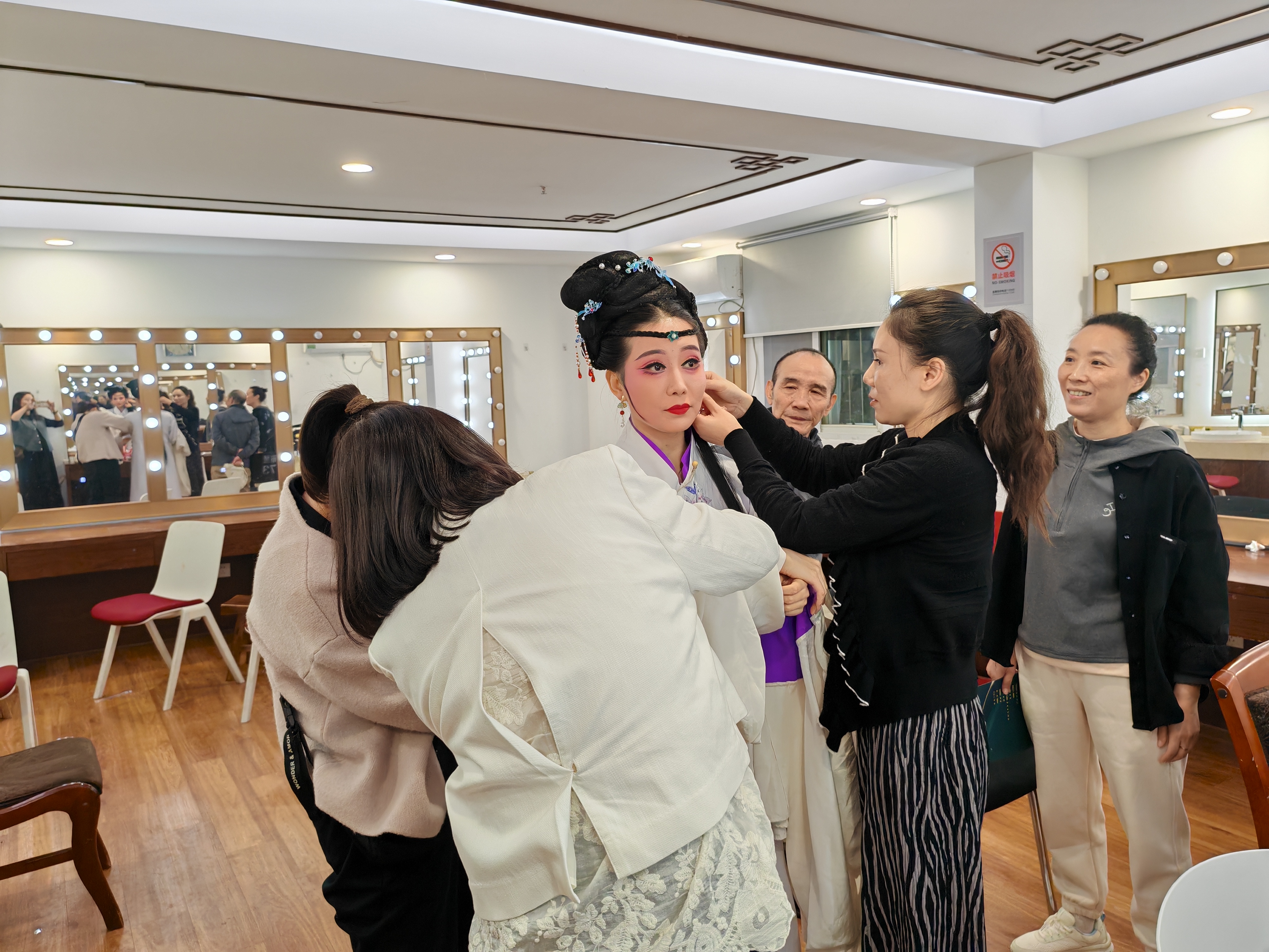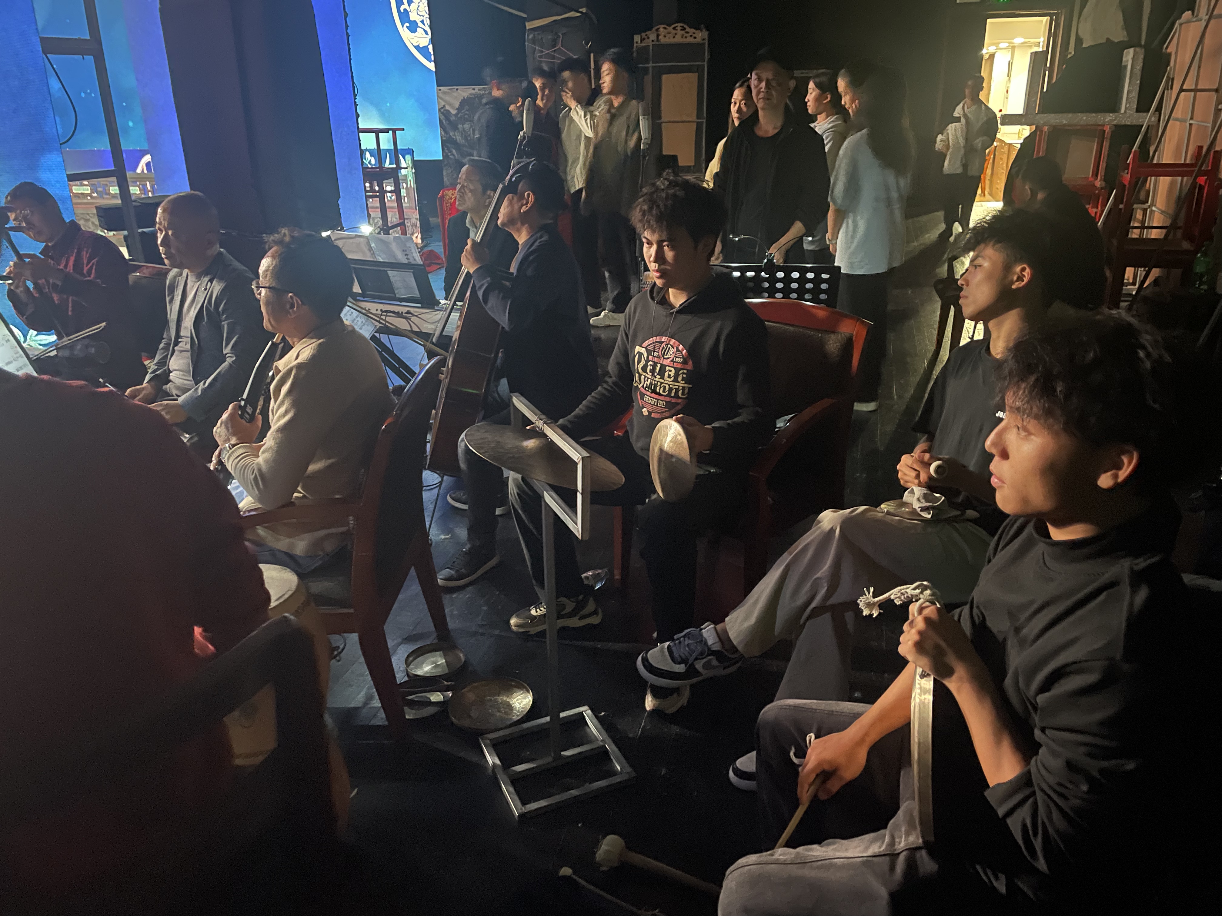 此外,本次演出是当天下午去、当天晚上演出,演职人员克服困难,就地吃盆饭,不挑不捡;演员悉熟舞台,乐队(文武)场摆场调试效音,舞美各部门紧密配合,团结齐心;二十多位演职员,有领导、有职工、有老有小,都围着一曲折子戏、一个参评演员(程聪)同志转,充分展现了阳新采茶戏传承中心的良好凝聚力和战斗力,真正践行了"一颗菜"团队精神。