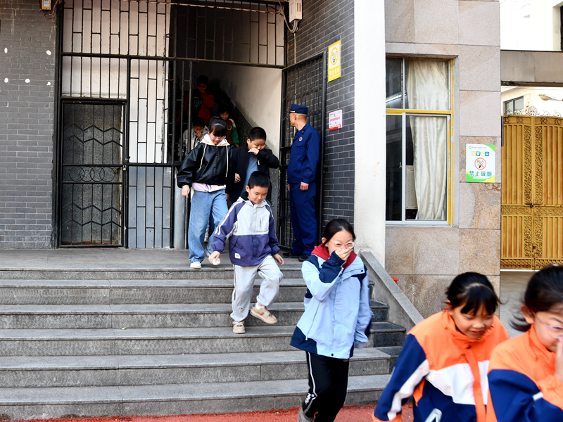 随着警报声响起,学生们在老师及消防员的引领下,俯身迅速撤离教室,沿安全路线迅速有序逃离“火场”,到达指定的安全区域,整个演练过程快速、安全、有序。