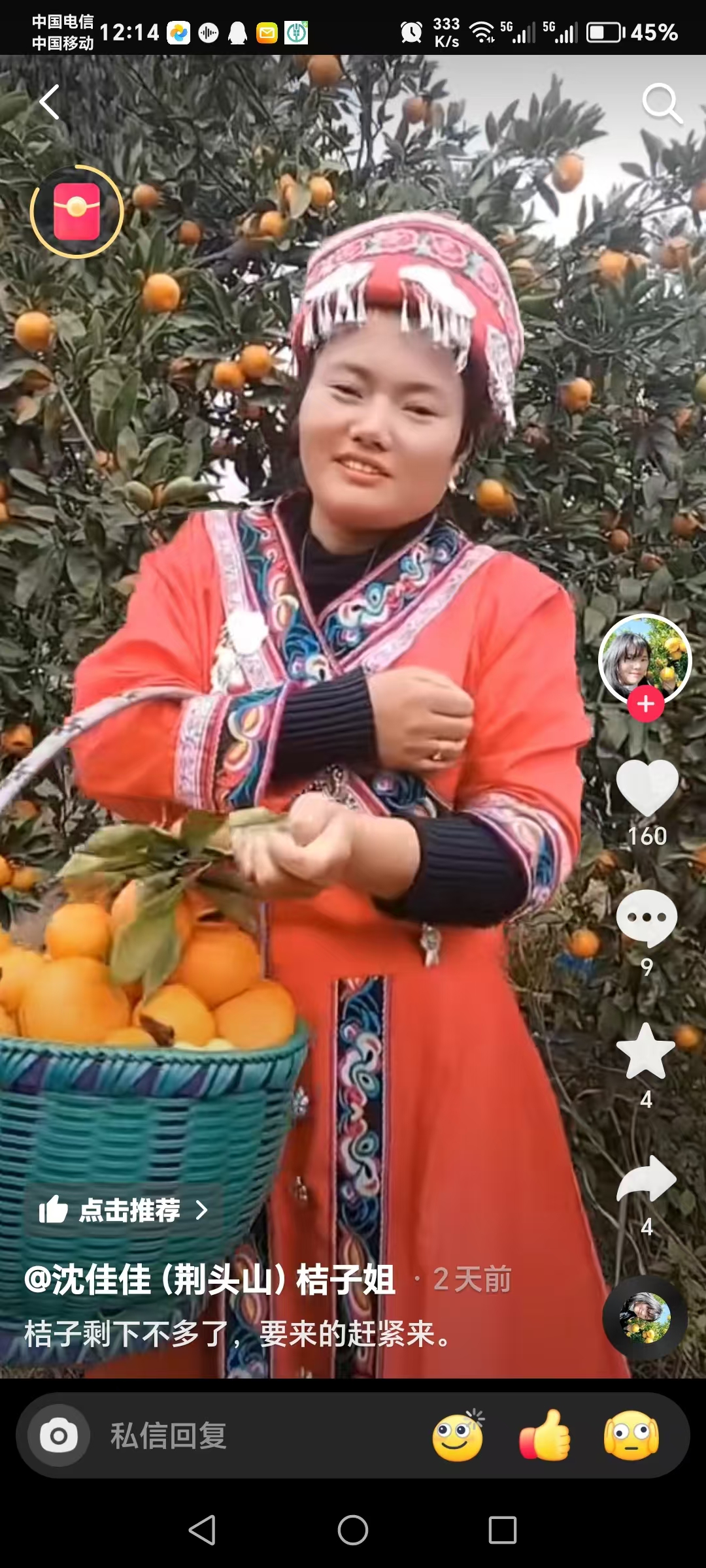 尝到甜头,沈佳佳更是在抖音上展现自我。11月21日,她身穿民族服装,发布作品到抖音里。有网友调侃道:“你这装扮不错,为了卖桔子,你也是拼了。”