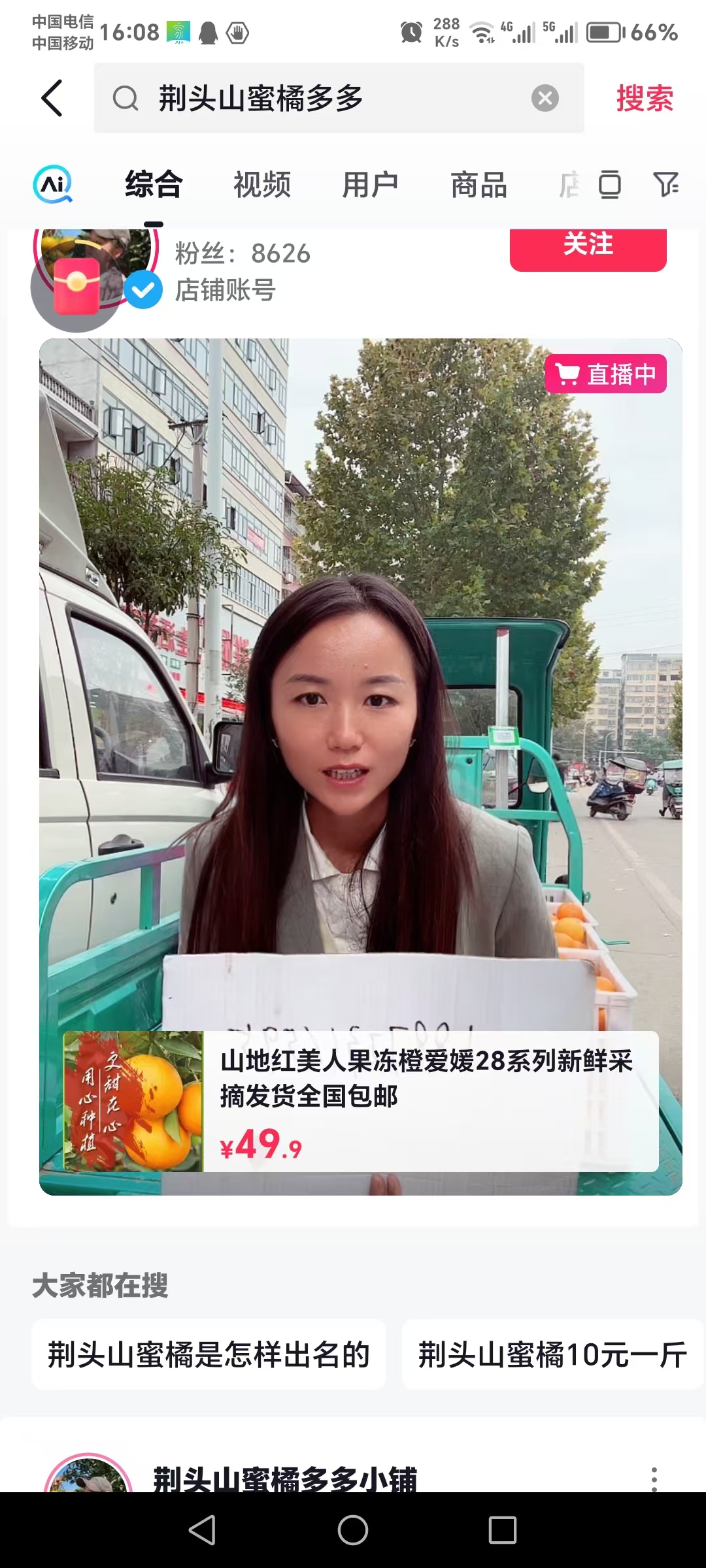 多多坦诚地介绍,刚开始,拍视频拍着玩,去年才开始在抖音平台推广荆头山的蜜橘、橙子等柑橘品种。今年,她又自己开了抖音店,始终在慢慢学习抖音直播带货,想通过平台把荆头山的柑橘推广出去,把婆家这边农户种的东西都能够有效地销出去,不能让农户辛辛苦苦种的果子等农产品放在家里烂掉。通过线上试水,价格也能卖得好点,这样让农户看到了希望,自己也就有成就感。
