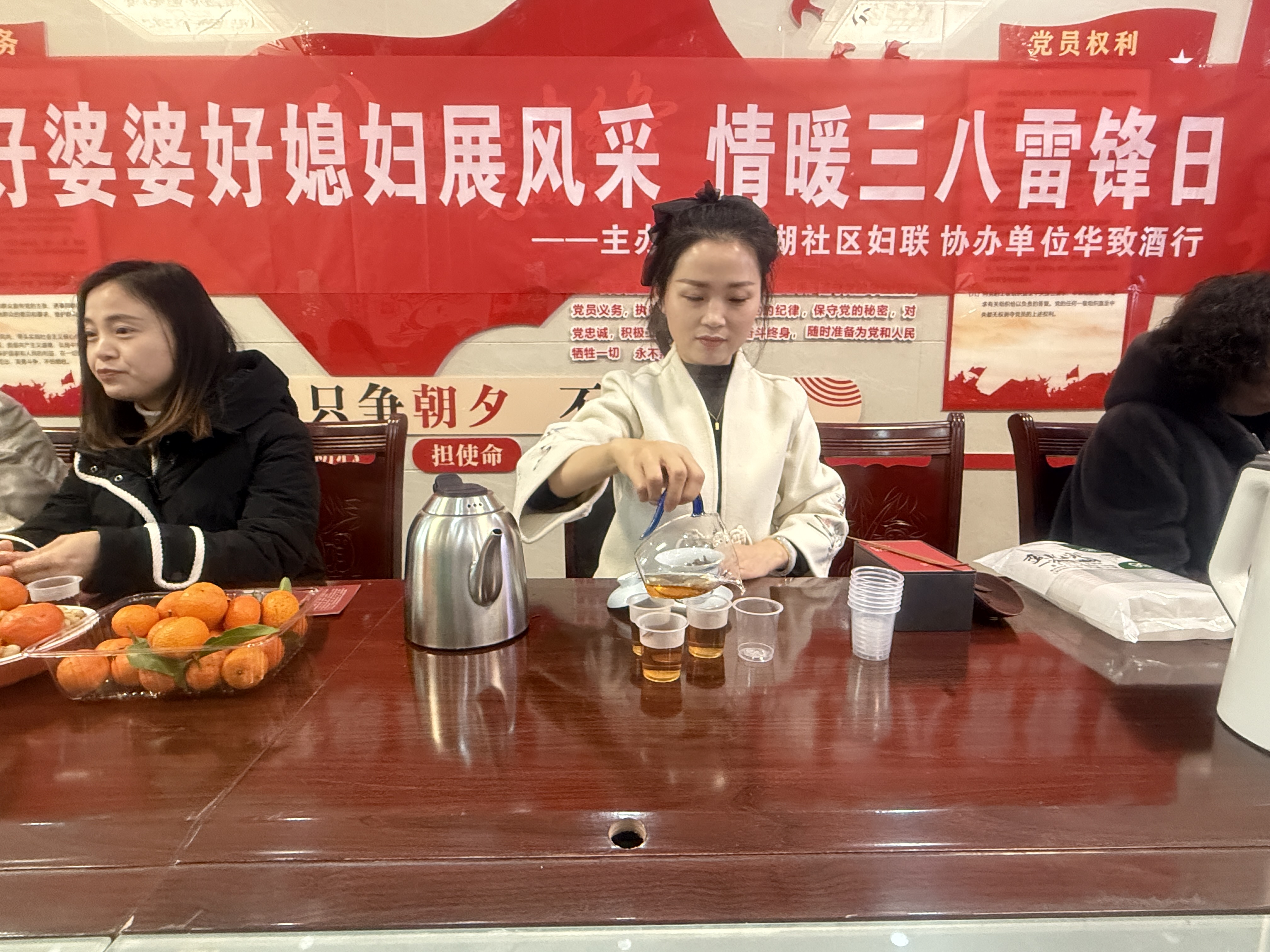 为大力弘扬雷锋精神,欢庆“三八”妇女节,3月5日上午,城东管理区滨湖社区妇联携手爱心企业阳新县华致酒行,开展了一场别开生面的茶话会暨“好婆婆好媳妇”表扬活动。