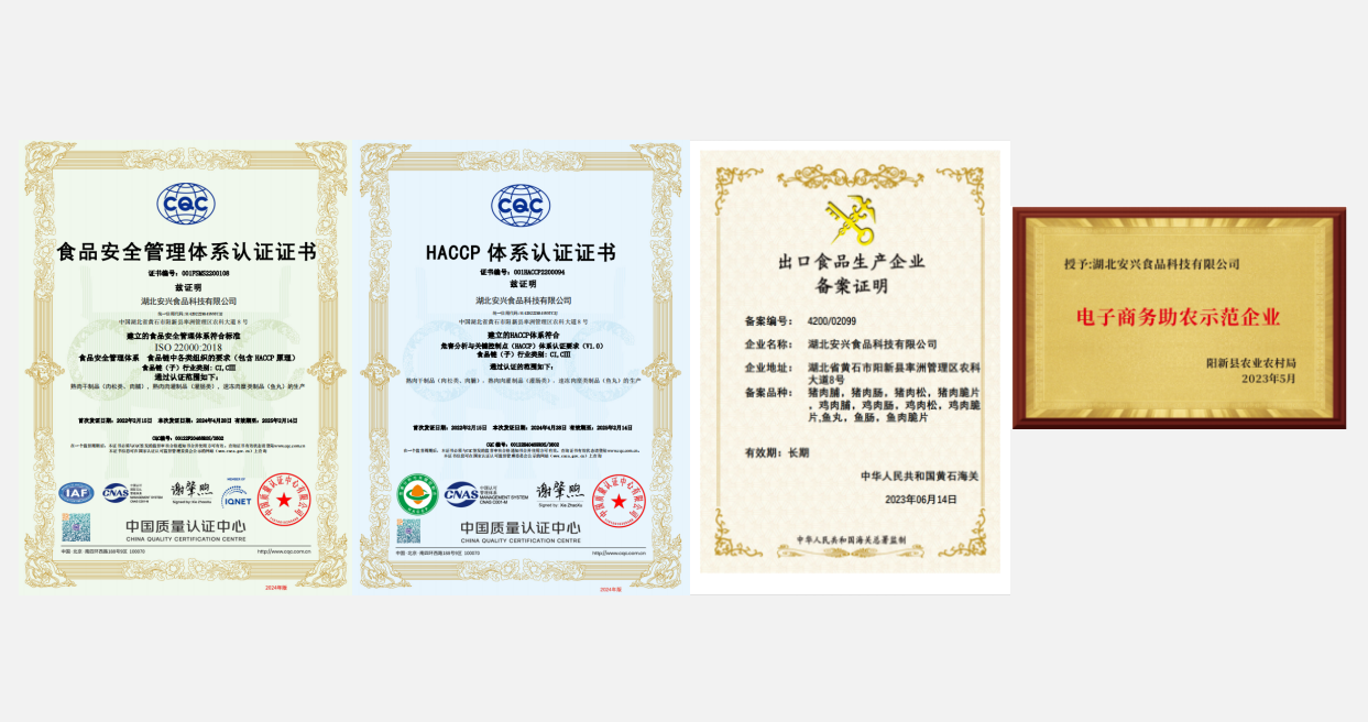 2023年安兴食品成功晋升规上企业,并获评“电商助农示范企业”。截至2024年12月,累计提报3项发明专利、取得8项实用新型专利,同年获授“黄石市农业龙头企业”称号,成为阳新县现代农业产业技术研究院产学研合作单位及湖北师范大学校外实习基地。依托进出口资质和科学化管理体系,企业实现从原料采购、生产加工到对外贸易的全链条标准化管控。