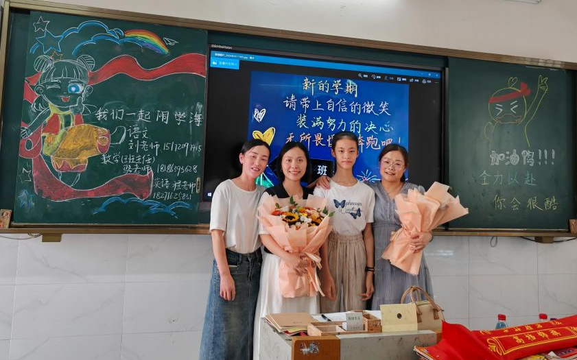 又是一年开学季,新的教室里又出现了刘老师忙碌的身影,正和新班级新的家长交流之际,刚毕业的灿灿同学映入眼帘,只见她和妈妈一人手捧鲜花,一人手拿锦旗,径直走到刘老师的跟前,几分羞涩的灿灿将鲜花递到老师的手上,看到熟悉的脸庞,老师忍不住挽起她的手,六年前个头才到老师的腰,现如今已比老师高出半个头,灿灿妈妈一边递过锦旗一边说道:“灿灿在家强烈要求我今天要带她来看一看老师,她说她真的好幸运,能有刘老师陪伴她六年小学时光,从教她握笔写字,到如今能独当一面,都是老师的功劳。”看着眼前的鲜花、锦旗,看着灿灿感激又不舍的眼神,那一刻刘老师心中全被惊喜与感动填得满满当当,谁说教育不是一场渡人渡己的修行?在润物细无声的日常关怀中,不仅仅是学生收获满满,收获更多的更是一路陪伴同行的老师。