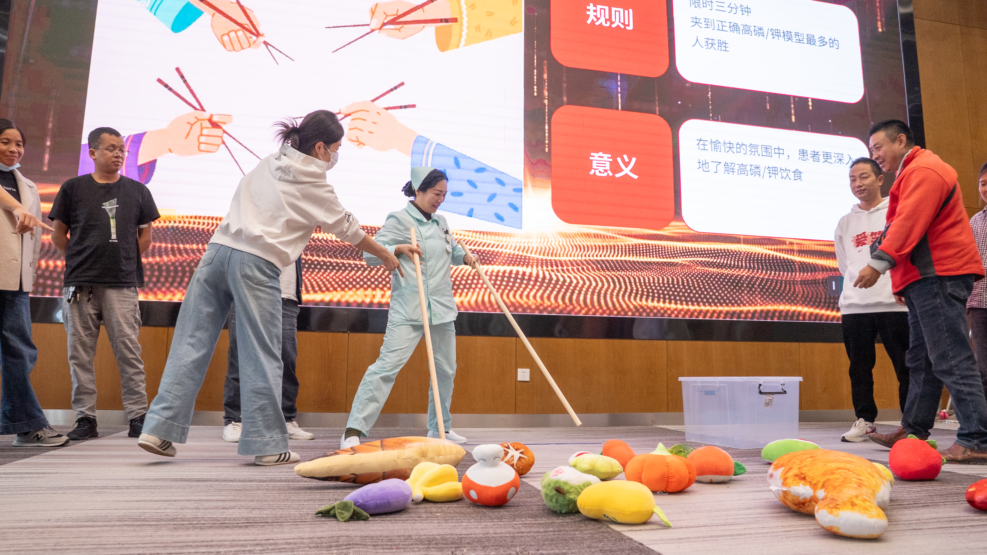 此次活动亮点纷呈,温情与欢乐交织。筷子英雄“磷”距离游戏让肾友在趣味中学会辨别高磷食物;明星肾友的榜样分享传递了坚韧力量。医护人员表演的《内瘘操》手势舞,将功能锻炼巧妙融入艺术,带动全场一起学习。最后,医患同跳《天天向上》舞蹈、欢乐的套圈游戏和颁奖环节,将气氛推向高潮。活动在全体人员的大合影中圆满落幕。