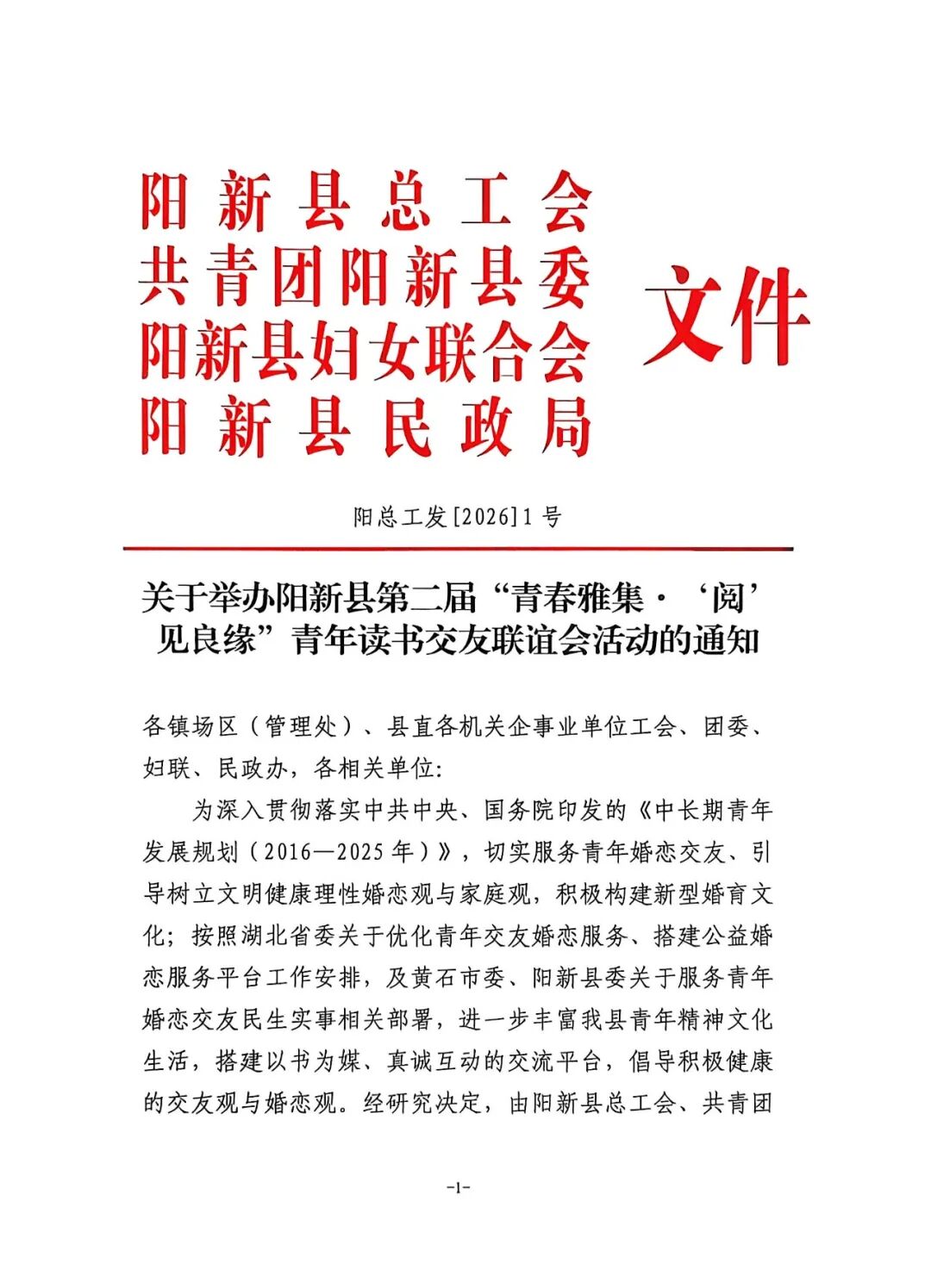 为丰富阳新县单身青年精神文化生活,搭建真诚、友好的交流平台,由县总工会、团县委、县妇联、县民政局联合主办的阳新县第二届“青春雅集·‘阅’见良缘”青年读书交友联谊会,将于近期温情启幕。