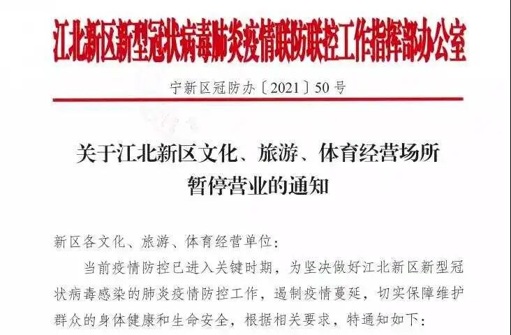 1.自7月26日起,江北新区范围内,文化馆(站、室)、展览馆、博物馆、图书馆(室)、图书阅读空间和体育馆等各类公共服务场馆暂停开放;营业性演出场所、互联网服务场所(网吧)、影剧院、歌舞娱乐场所(KTV)、游戏游艺娱乐场所、游泳场所、健身经营场所、景区等各类公共场所暂停营业;暂停一切聚集性演艺活动;所有旅行社暂停一切组织来宁、离宁旅游业务。