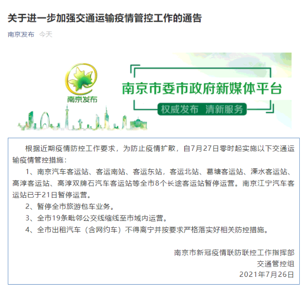 7月26日,南京市发布最新通告,27日起全市8个长途客运站停运 出租车网约车不得离宁。