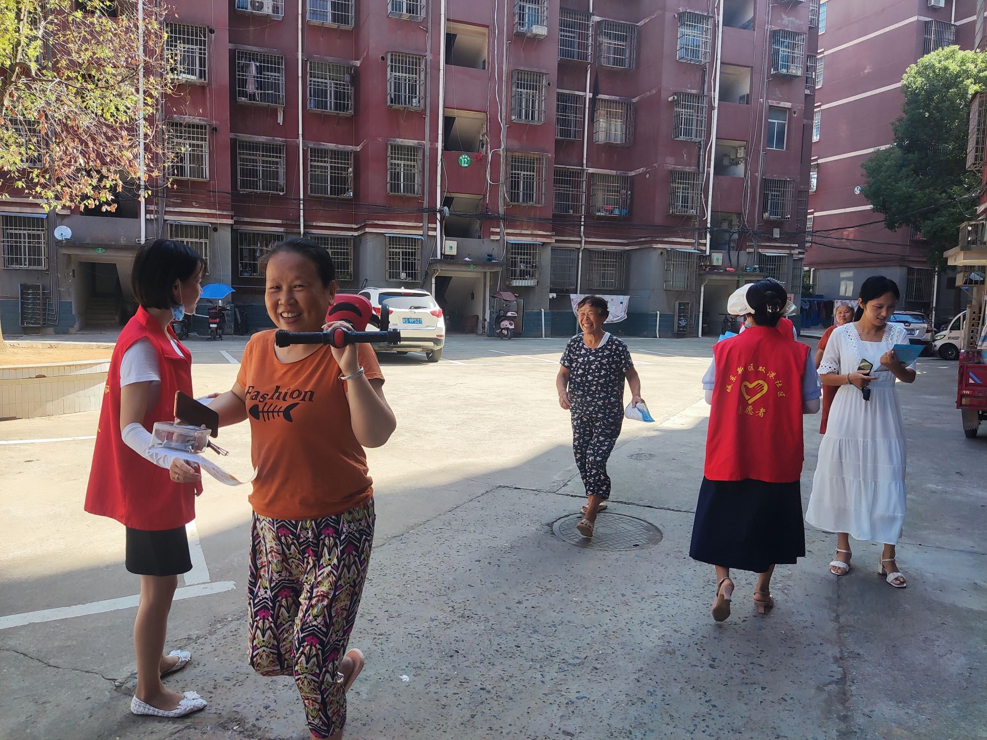 活动开始前,社区志愿者和物业工作人员帮助剧团搭戏台,摆道具,准备座椅。各位演职人员提前装扮。同时社区志愿者们为居民发放反诈宣传单页,向居民普及宣传《民法典》的重要性,引导居民们通过法律维护自身的权益。
