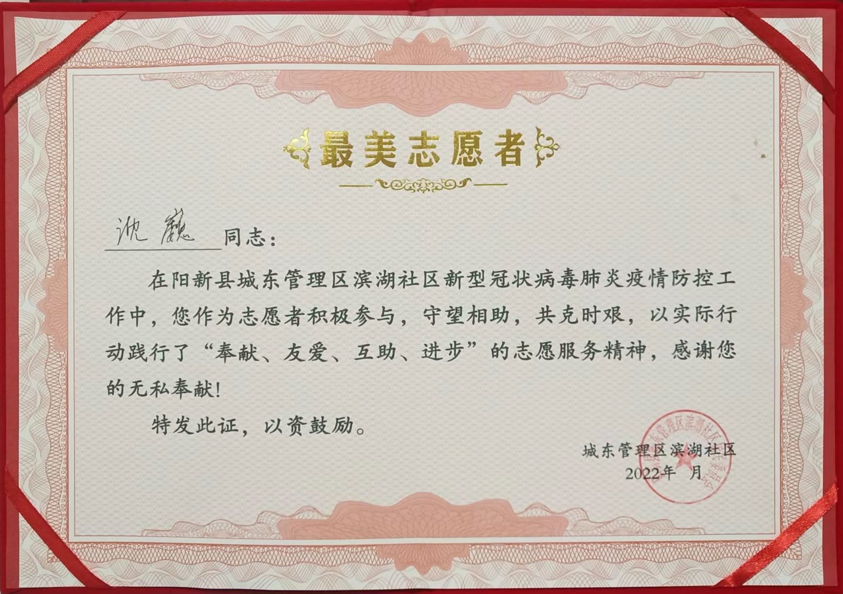 近日,城东管理区滨湖社区开展2022年度"最美志愿者"助力防疫抗疫专题表彰活动,授予沈巍、曹庭龙等60余名同志"最美志愿者"称号。在颁发荣誉证书后,滨湖社区党总支书记邵文兴还为他们送上了米、油、口罩等奖励”套餐“。