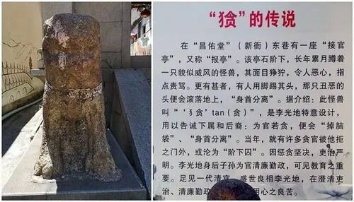 在湖头镇李光地故居前,立有一座动物雕像,名为“犭贪”,其生性贪婪。这只的首部与身体最初是断开的,李光地把断首的“犭贪”放在门口,用以告诫后裔:为官若贪,便会“掉脑袋”“身首分离”。在李光地故居新衙大厝的厅堂里,四幅李光地的亲笔诗作高高悬挂,其中一首这样写道:“家传一首冰壶赋,庭茁千寻玉树枝。”这是李光地一生清廉为官、勤政爱民的真实写照,同时也激励着后人要像他一样,心如明镜、志向高远、奋力拼搏,为国家多做贡献。