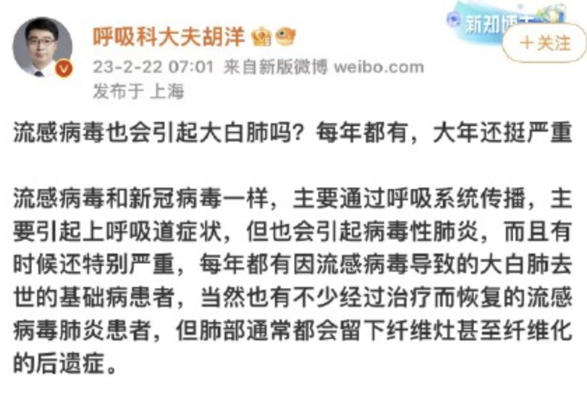 据媒体报道,感染流感后大部分患者都是轻症病例。但需要知道的是,流感也会引起“白肺”,且这种情况每年都有发生。据上海市肺科医院呼吸内科副主任医师胡洋微博发文,甲流和乙流两种类型的病毒都有可能导致流感病毒肺炎。对免疫力低下、年龄较大或有严重基础病的患者而言,感染肺炎的可能性更大。感染肺炎的表现为咳嗽、咳痰持续不好转,逐渐出现呼吸困难、低氧血症等。
