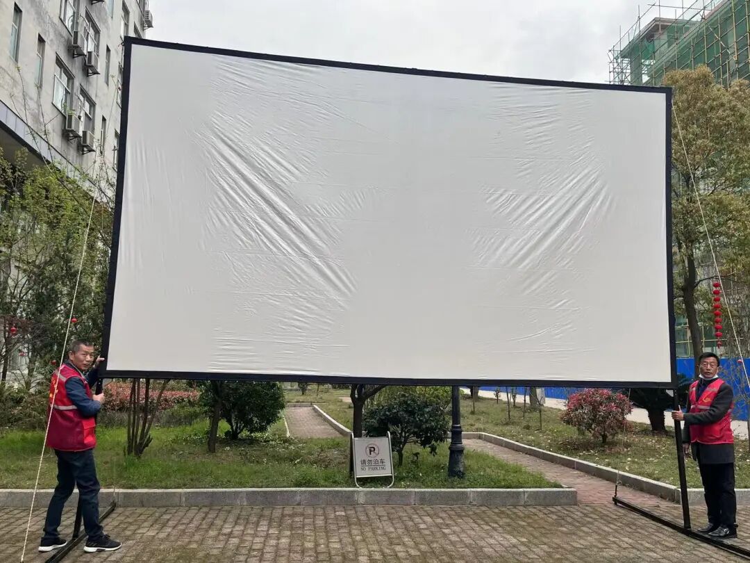 当天,放映员们早早地驱车前往敬老院,在大院里挂好了幕布,做好了充足的准备。
