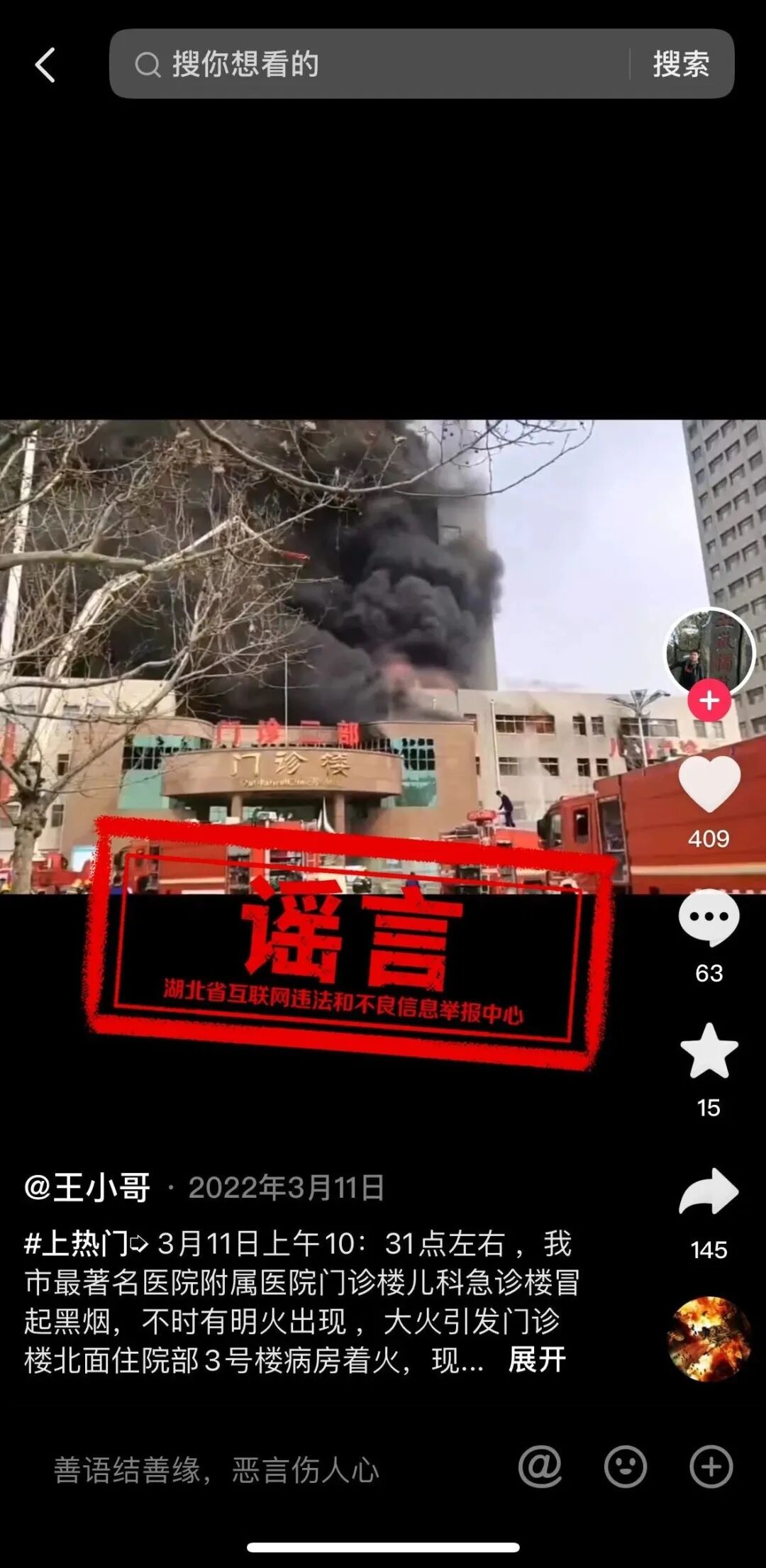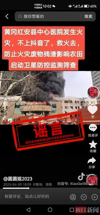 4月9日,抖音账号“圆圆姐2023”发布视频称,湖北省黄冈市“红安县中心医院”发生火灾。经极目新闻记者核实,视频中起火地点并非湖北省红安县的医院,而是山东省滨州市某医院;红安县没有一家“中心医院”,目前红安县各医院均正常为居民提供医疗服务。