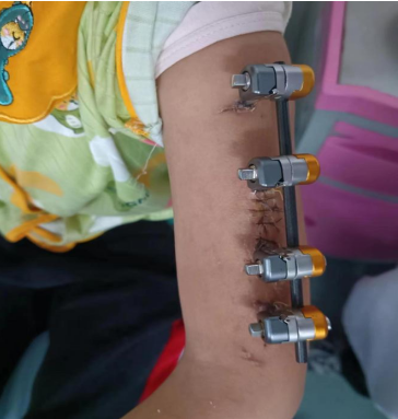 医院收治后,推荐两种手术方案,一是弹性髓内针内固定术加石膏外固定术,二是小切口切开复位克氏针内固定加外固定支架固定术。经家属沟通后,患者家属选择外固定支架固定术。整个手术过程中顺利,骨折复位固定良好。术后,患者家属表示对手术效果满意。