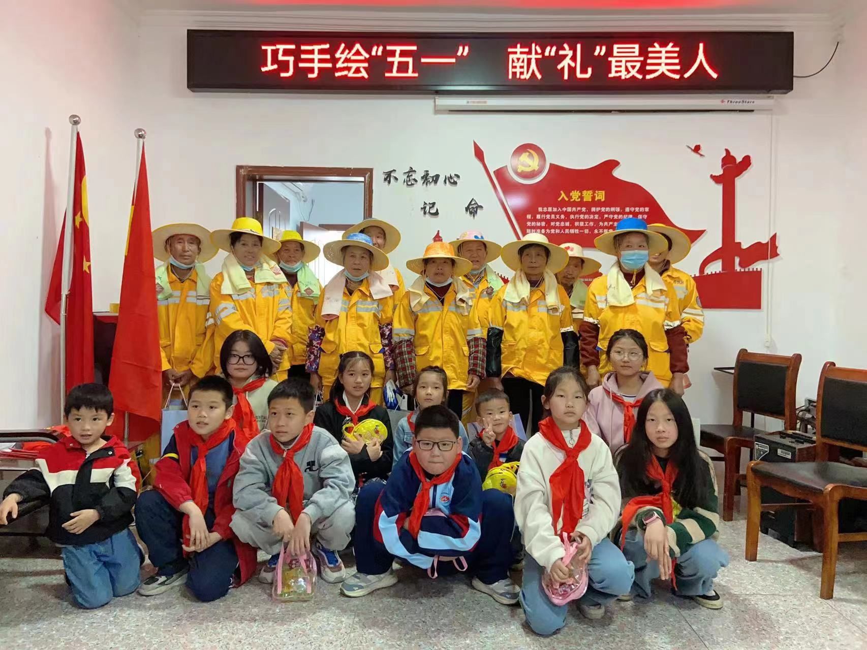 “太阳光金亮亮,雄鸡唱三唱...幸福的生活从哪里来,要靠劳动来创造”。活动的结尾部分被响亮的合唱声推向高潮,现场的10余组亲子家庭与10余名环卫工人一起合唱“劳动最光荣”,歌颂劳动者,赞扬劳动者爱岗敬业无私奉献的精神。最后,社区将精心准备的洗衣液、香皂、毛巾等礼品一并送给了环卫工人。
