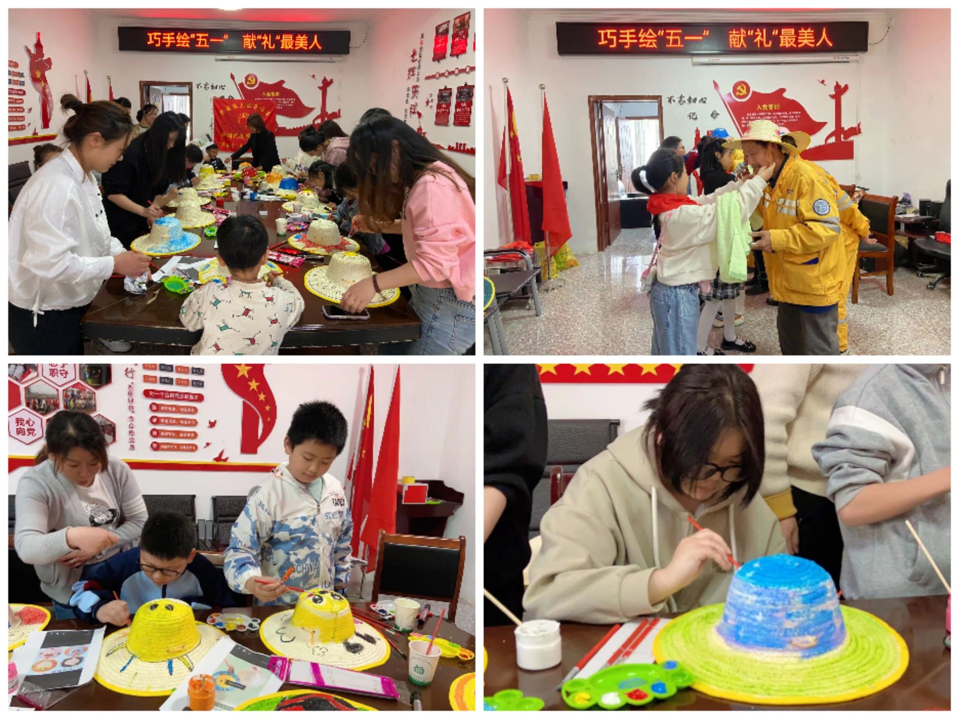 五月的鲜花,为劳动者绽放。活动开始,志愿者为孩子们普及了“五一国际劳动节”的由来和发展。接着,10余组亲子家庭齐上阵,个个精神饱满,在志愿者的引导下,用提前准备好的丙烯颜料,在草帽上兴奋地开始作画,五颜六色的动物、千奇百怪的虫子,小朋友们凭借自己的想象力,以画传情,用画笔向五一国际劳动节献礼。随后,他们将自己手上画好的草帽,献给了参与活动的环卫工人,并向劳动人民敬礼,以表示对劳动者的尊重,同时也在孩子们心中种下了“劳动最光荣”的种子。