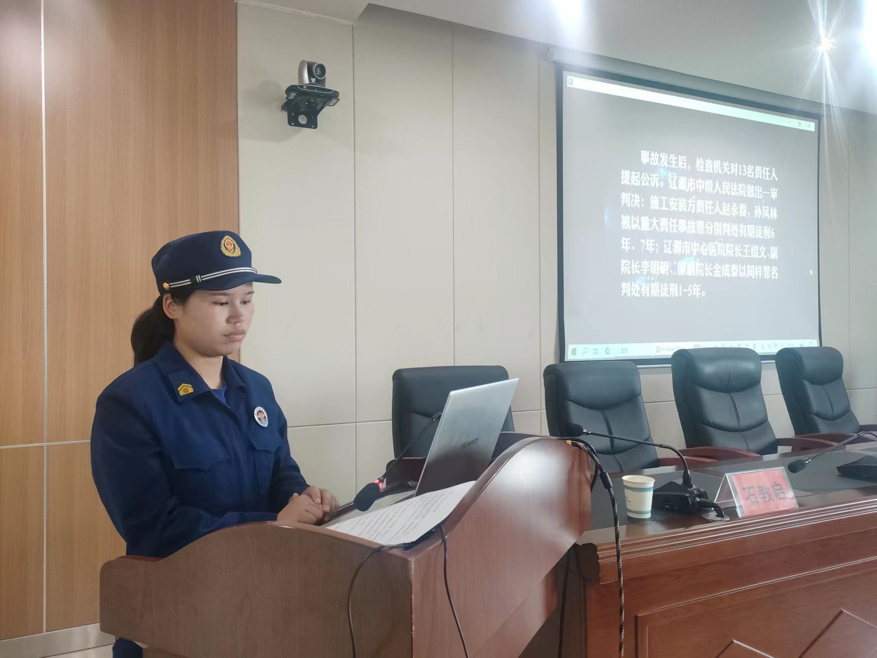 培训中,教官们首先组织大家收看了《生命至上 警钟长鸣》安全生产警示教育片,通过一个个典型案例,触目惊心的图片、视频,深刻剖析了造成医院安全生产事故发生的主要原因以及应吸取的经验教训、事故责任,用“血的教训”警示职工要高度重视消防安全,使观看人员深受震撼。