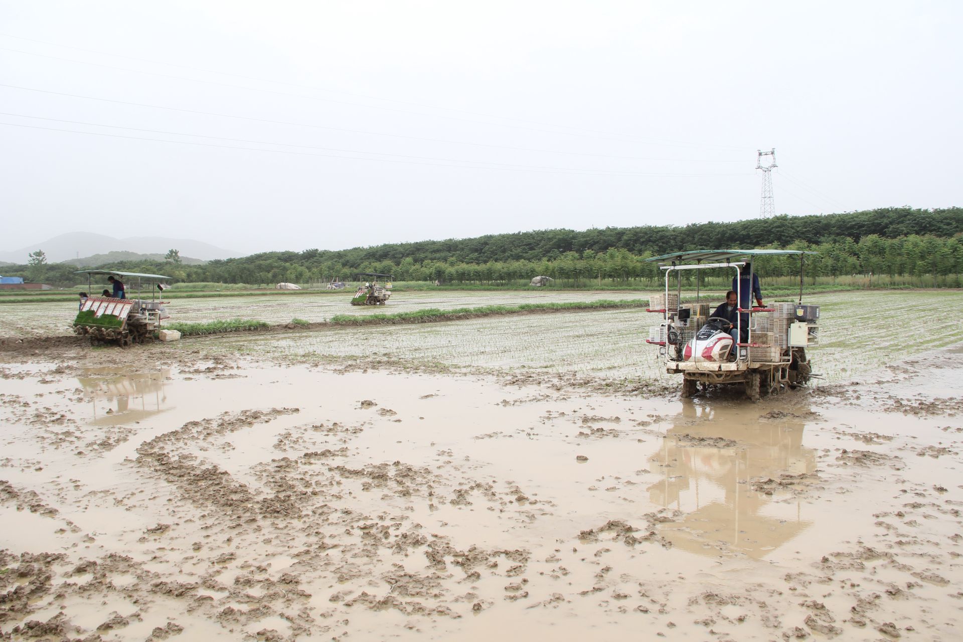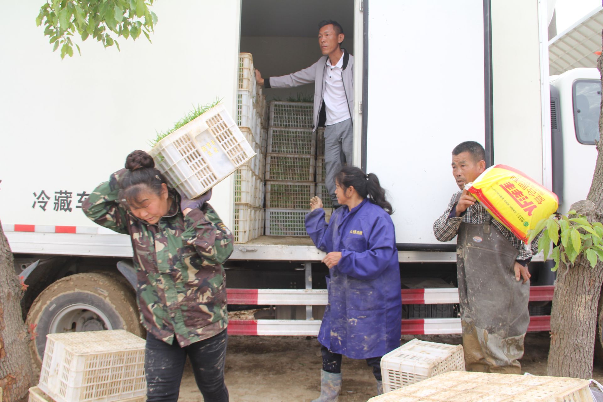 最显眼的是水田里的3台水稻插秧机,在田里来回穿梭,一排排绿油油的秧苗被齐整划一地栽植在稻田里,像一块块绿色的地毯在田野间铺展开,显示出一片生机勃勃的景象。田埂旁的机耕路上,工人们从冷藏货车上,卸下从育秧工厂运来的一箱箱秧苗,不时地填充到插秧机。“这5箱秧苗可以插一亩田,一车可装300箱,可以插60亩。”富河润塔农业科技有限公司工作人员肖唐湖介绍说。