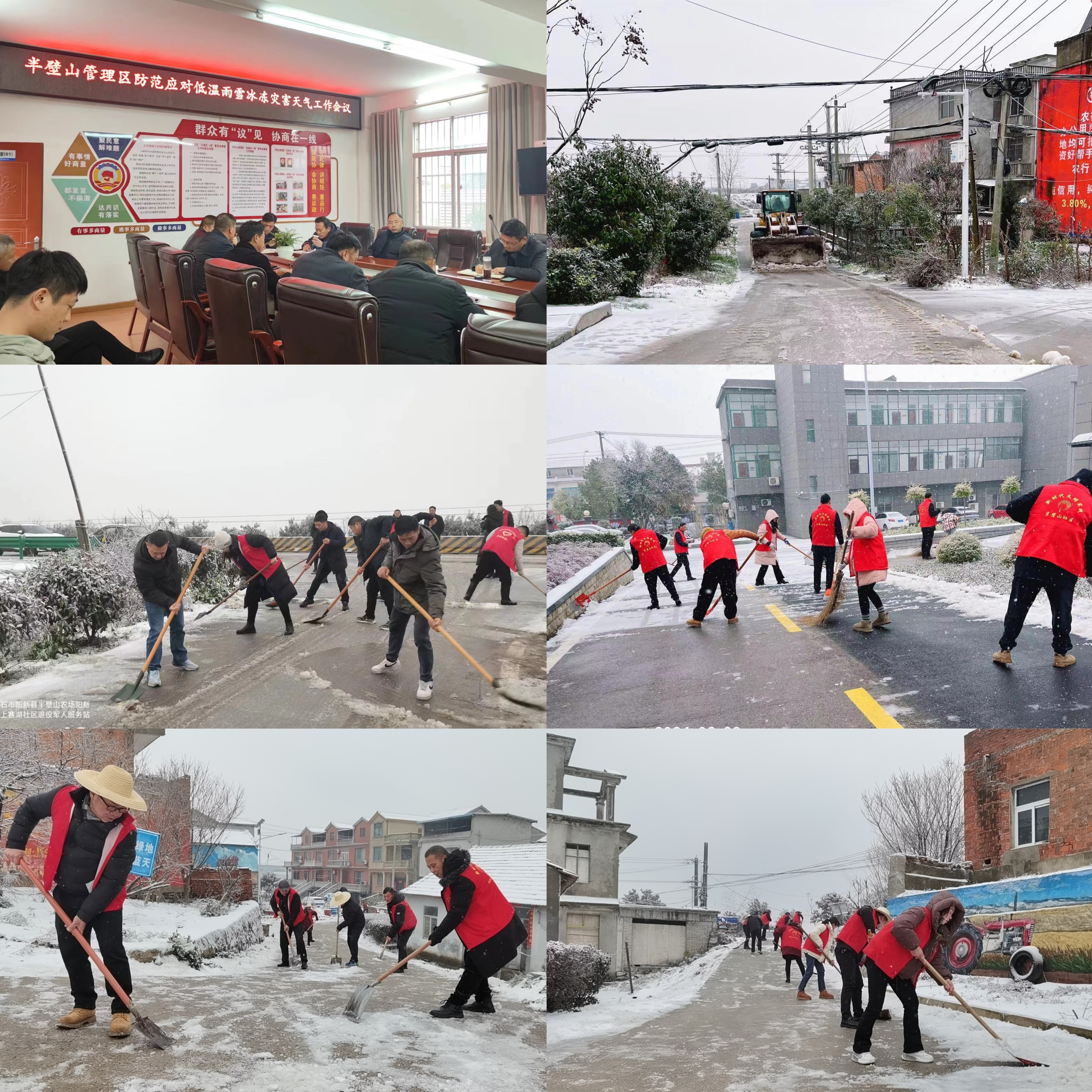 接到天气部门预警通知后,管理区迅速成立工作专班,多措并举,确保群众生产生活安全。一是党委靠前指挥,第一时间下沉社区,靠前开展应对灾害天气工作。二是加强宣传,及时发布天气预报,提高群众防范灾害的意识。三是机关干部下沉社区,加强社区力量参与清路保畅通,排查安全隐患。四是成立若干应急分队、物资保障分队,确保应急物资的保障供应;由农办、农技中心、农业开发有限公司等单位工作人员组成的农业生产应急队,到田间地头为群众服务,及时处置农业灾害;由社区党员干部、志愿者、机关下层沉干部组成志愿者服务队进行除雪清扫,为社区居民生活出行提供方便;道路安全分队,负责清除道路积雪,维护车辆行车安全。五是确保应急物资供应,2月22日以来,已投入铲车等机械十余台套、盐2吨、铁锹铲雪工具500余把等工具和物资。