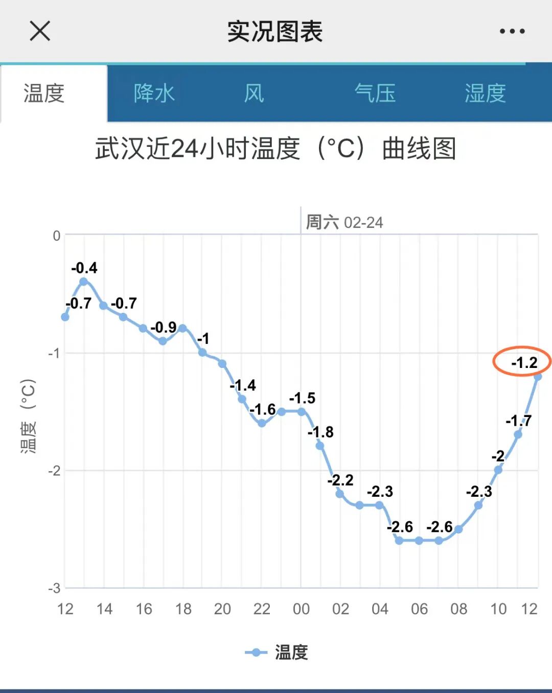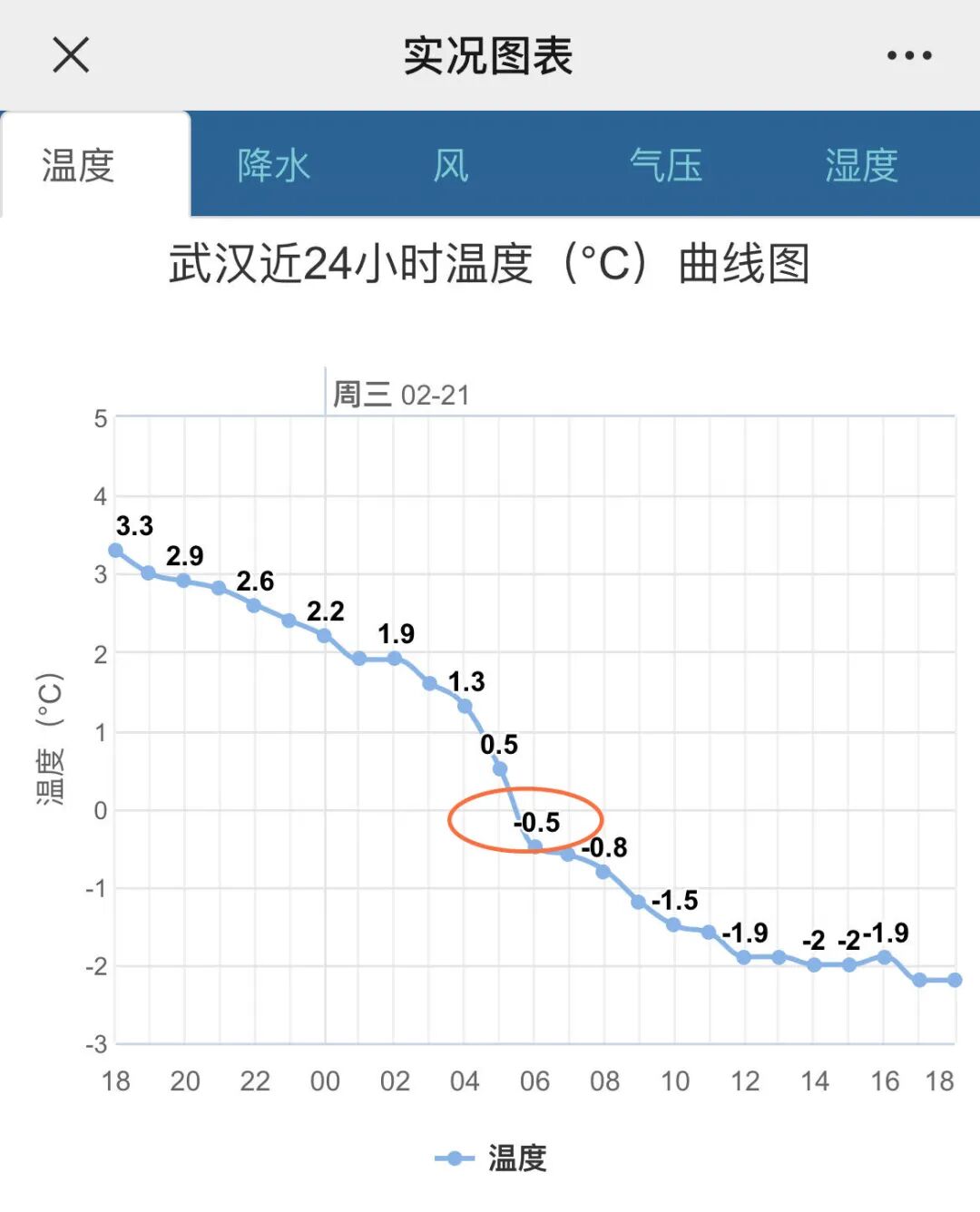 从气温而言,自21日清晨6时(-0.5℃)跌破冰点,武汉就持续在0℃以下,截至今日12时(-1.2℃),已连续78小时0℃以下了,冷冻了这么久啊,确实很冻人。