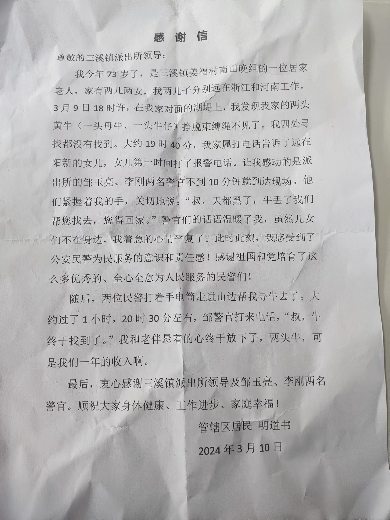 “随后,两位民警打着手电筒走进山边帮我寻牛去了。大约过了1小时,20时30分左右,邹警官打来电话,‘叔,牛终于找到了。’我和老伴悬着的心终于放下了,两头牛,可是我们一年的收入啊”。感谢信中,这样细致地描述着。