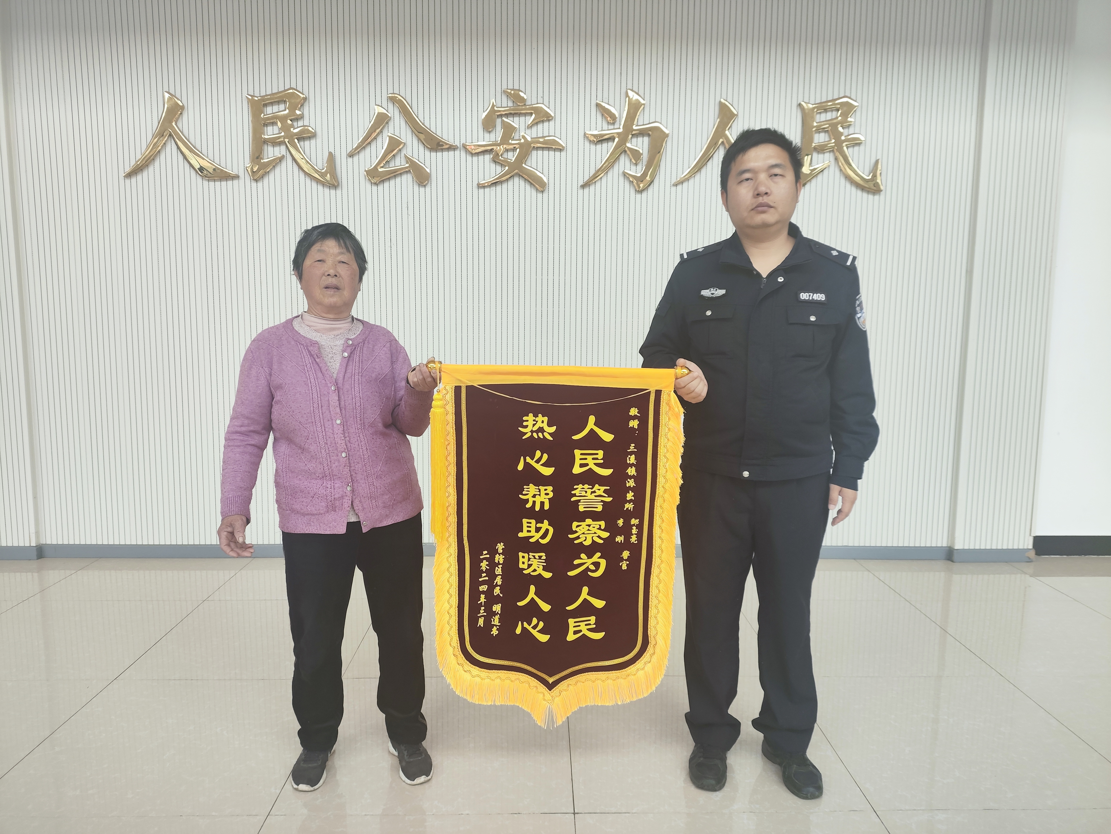 “我女儿说,你这警官真‘牛’,让我一定送面锦旗来感谢。”3月14日上午8时30分许,姜婆婆突然出现在三溪派出所门口,给民警送来一面书有“人民警察为人民,热心帮助暖人心”字样的锦旗,还有一封全面原来当时情景的感谢信。她说,写感谢信也是她女儿的主意,女儿称,写出来的是民警真心为民的爱民情怀。