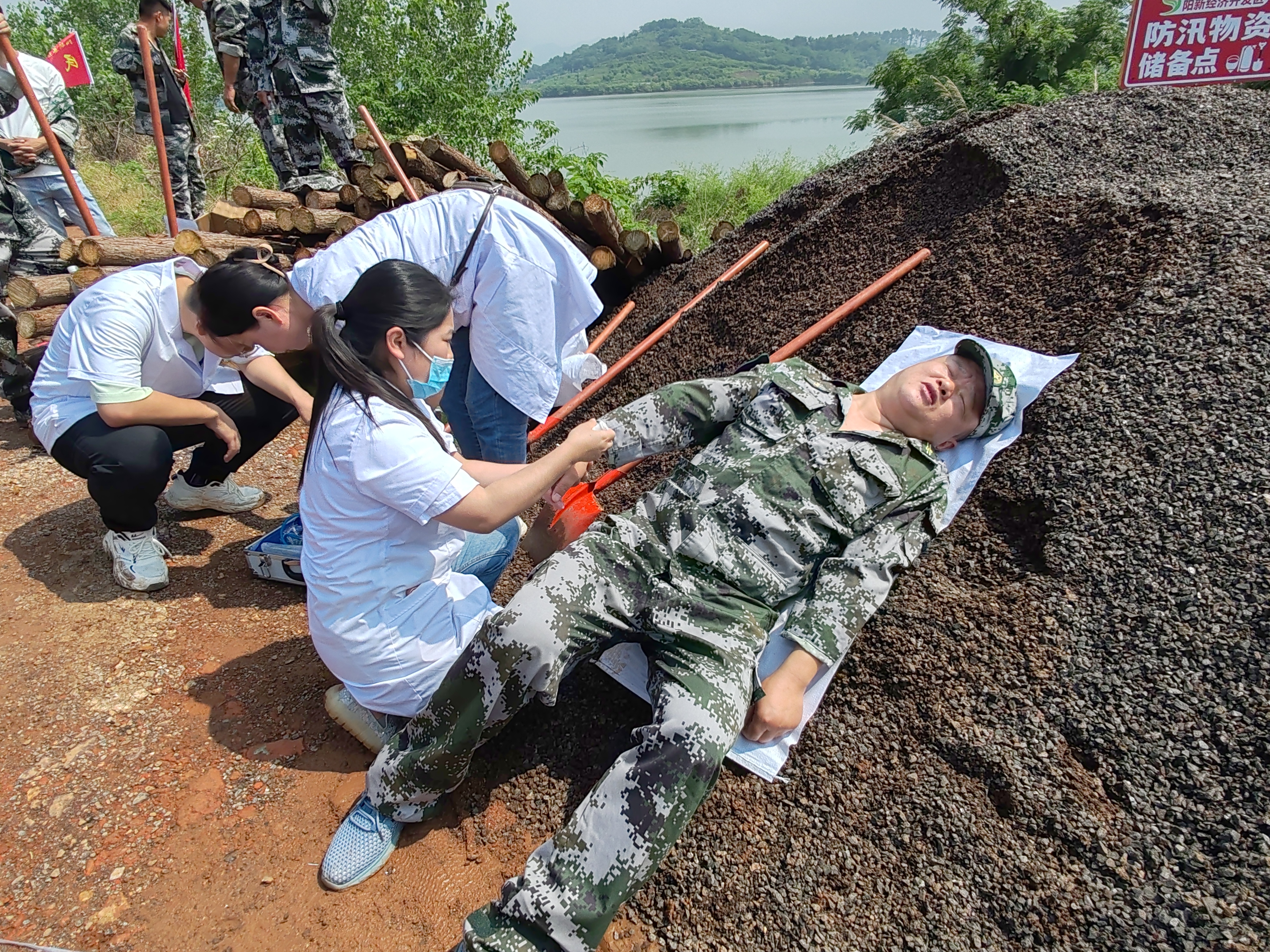 到达险情点,突击队员立即分两组填装砂石,在水利站技术人员指导下分别对管涌处挖去软泥,对周围用土袋码砌成围井,分层抢铺反滤料并设置排水孔,以削弱井内涌水,消除险情。医务人员对抢险中受伤的人员开展医疗救助,进行伤口包扎。