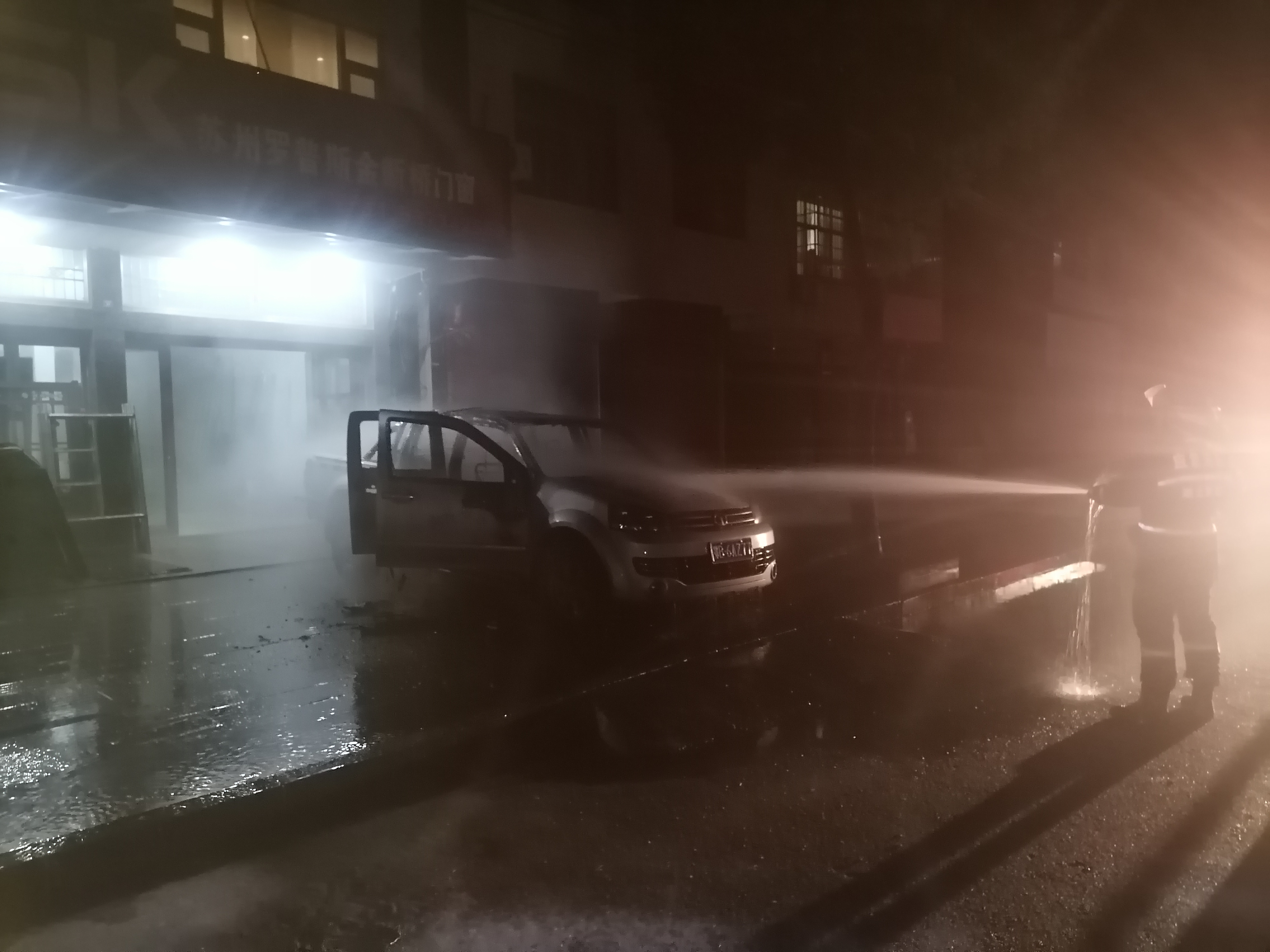 到达现场后发现,发现一辆灰色皮卡停放在路边,车内无被困人员,皮卡后座已燃起熊熊大火,现场浓烟滚滚、火光冲天。危急时刻,消防救援人员使用高压水枪进行灭火,现场火势逐渐被压制,对车辆内部进行注水降温。经过5分钟的紧急扑救,火灾被成功扑灭,皮卡车后座部位受损严重,所幸没有造成人员伤亡。