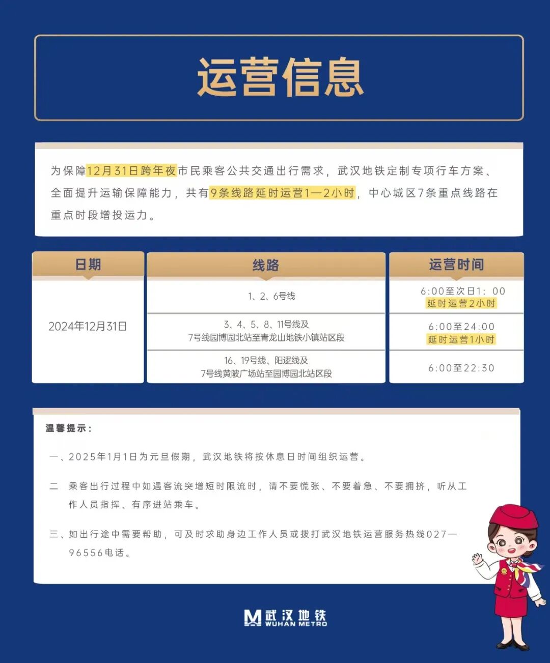 为保障12月31日跨年夜市民乘客公共交通出行需求,武汉地铁定制专项行车方案,全面提升运输保障能力,共有9条线路延时运营1—2小时,中心城区7条重点线路在重点时段增投运力。