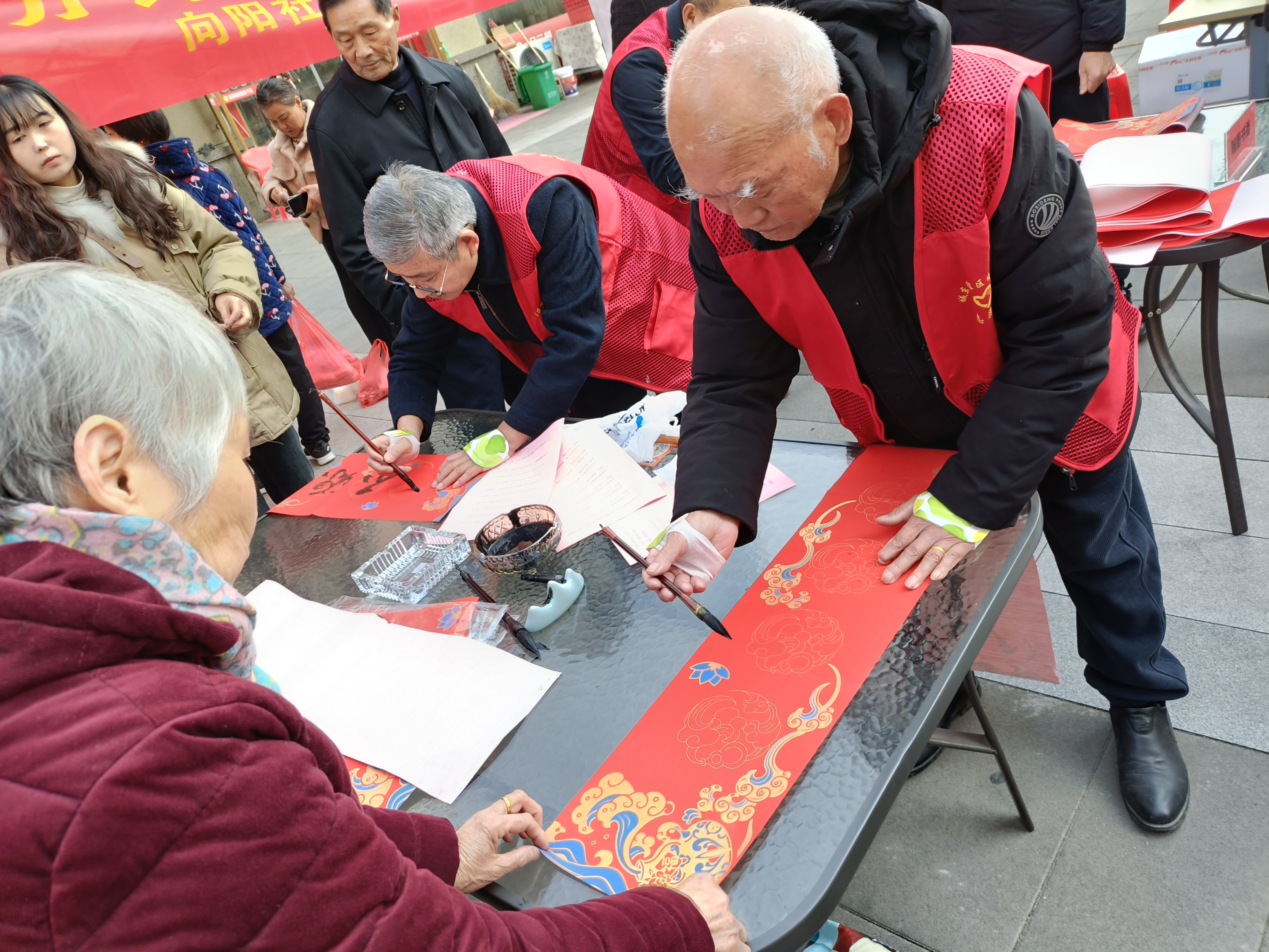 写对联的摊位前更是热闹非凡,墨香四溢。书法大师和翰墨书香志愿队的书法爱好者们饱蘸浓墨,笔走龙蛇,创作出一幅幅对仗工整、寓意美好的对联。居民们纷纷排队求墨宝,对大师们的作品赞不绝口。