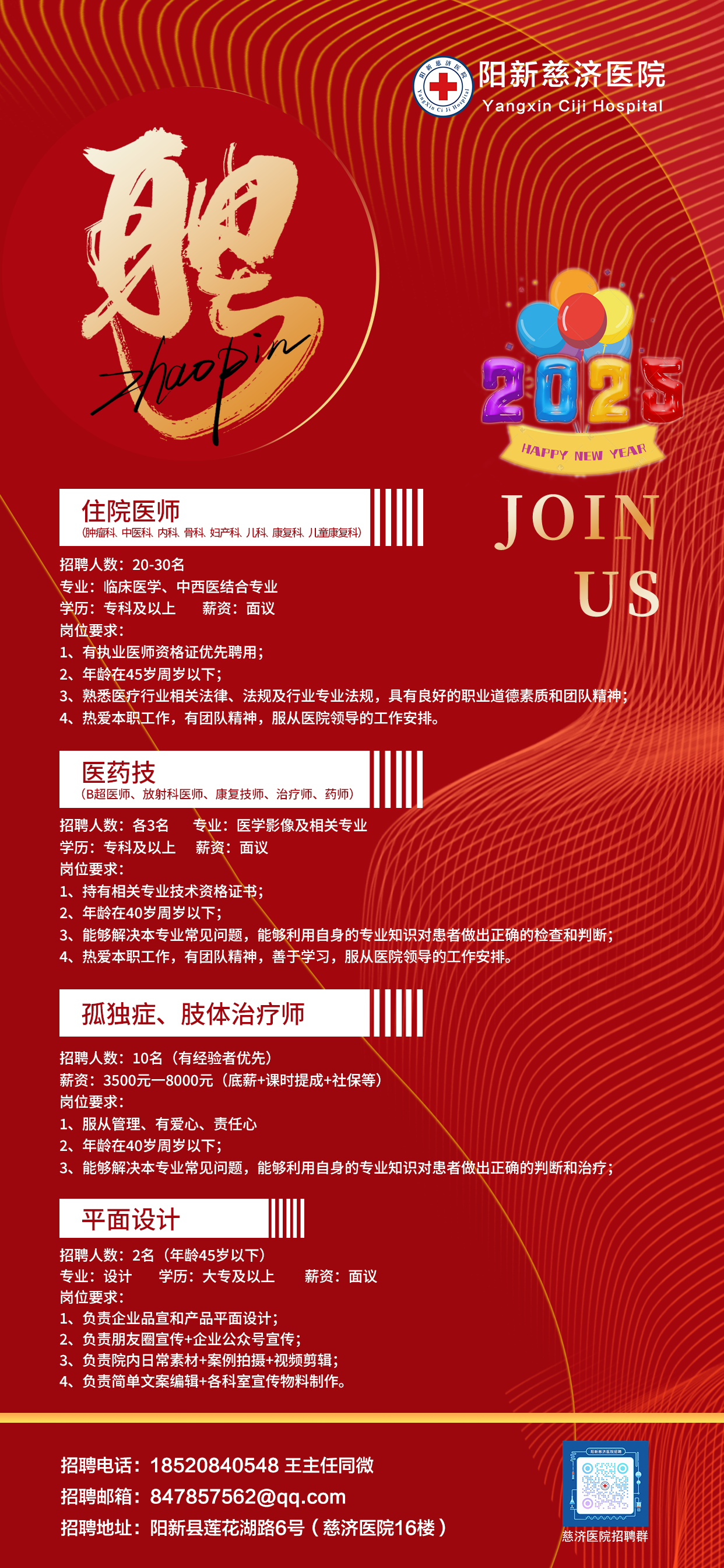 在这春意盎然、生机勃勃的季节里,阳新慈济医院沐浴着阳光,满怀信心地迎来了新的发展篇章。为了更好地服务广大患者,提升医院整体实力,现面向全国招聘一批优秀人才,共同谱写医院发展的新篇章。