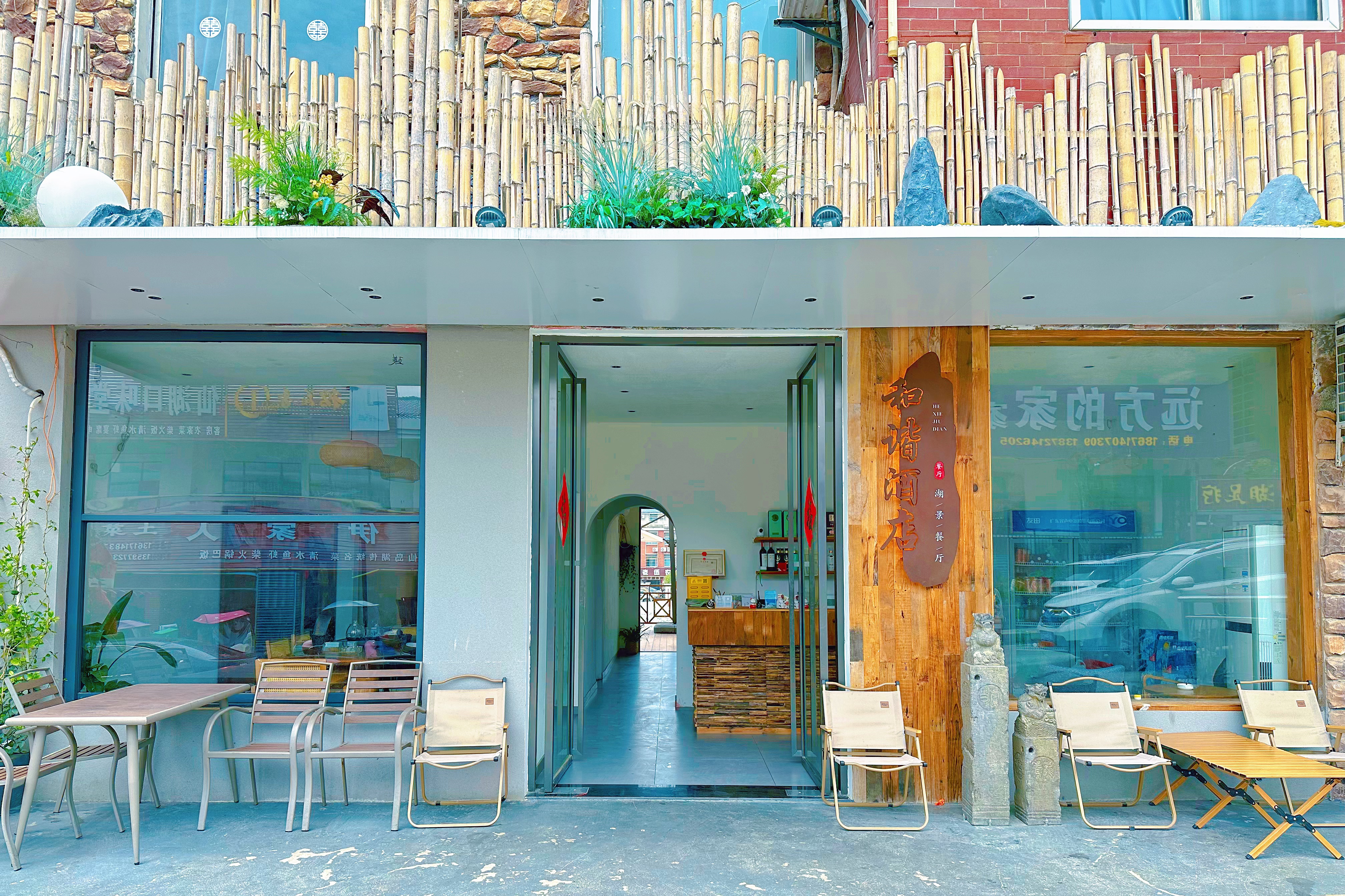 从酒店独具匠心的设计风格不难看出他的用心琢磨,为保证设计出彩,他特意找了专业设计团队,设计风格既保留了乡村的质朴与自然,又融入了现代简约的美学元素。店内采用原木桌椅、竹编灯饰、手工艺品等装饰,营造出温馨舒适的用餐氛围。同时,酒店后院还建了一处露天餐区,配有音响设备,平台上面搭着几处多功能遮阳伞,七月的黄昏在这里小憩别有一番滋味,依靠着木质栏杆,感受湖面清风掠过脸庞,望着四周泼墨般的山形,暮色被衬得分外轻柔,那妙意在心中荡漾,人便真正静了下来。游客可以在星空下,在湖畔边享受美食,感受大自然的馈赠,欣赏如诗如画的自然景色,无论是山色空蒙烟雨季,还是银装素裹凛冬至,都为用餐体验增添了一份独特的浪漫与宁静。