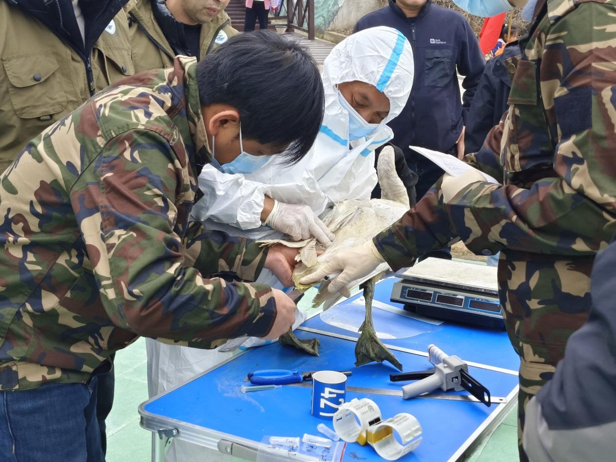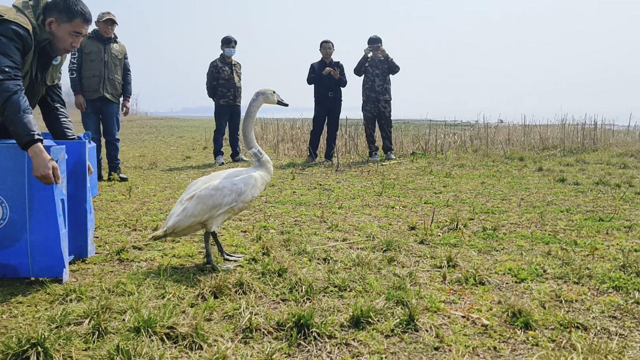 工作人员对小天鹅们进行了咽、肛拭子采样,并详细测量记录了每只小天鹅的喙、翼、足、尾等各部位身体数据,为它们佩戴好颈部信号发射器后,在网湖边的滩涂上,将它们放归自然。