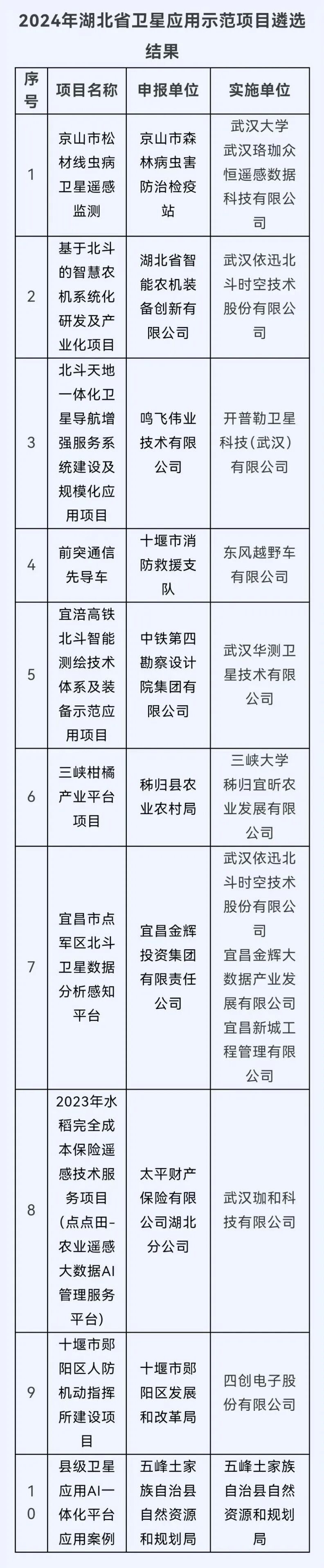 卫星应用作为国家战略性高技术产业,是湖北省构建“箭、星、网、端”全产业链生态体系的重要一环。此次开展卫星应用示范项目评选,旨在引导更多政府部门、企事业单位应用卫星通信、导航、遥感数据,用卫星数据赋能千行百业,促进湖北商业航天产业高质量发展。