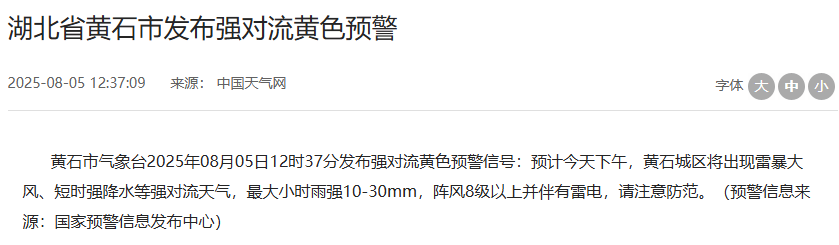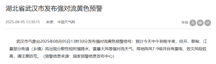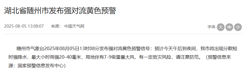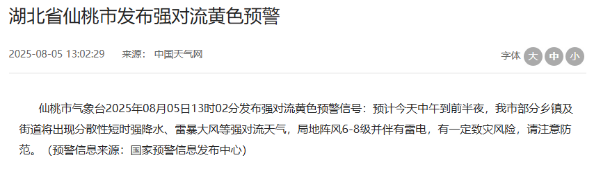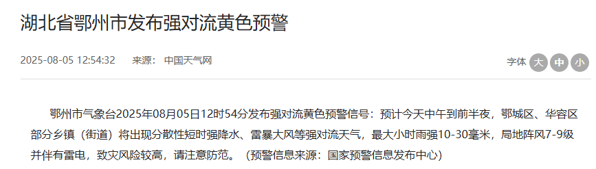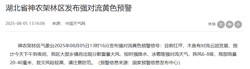 8月5日中午,湖北多地发布强对流黄色预警。今天下午到夜间,局地阵风7-9级,其中,神农架林区大部乡镇将出现分散雷暴大风、短时强降水、冰雹等强对流天气。