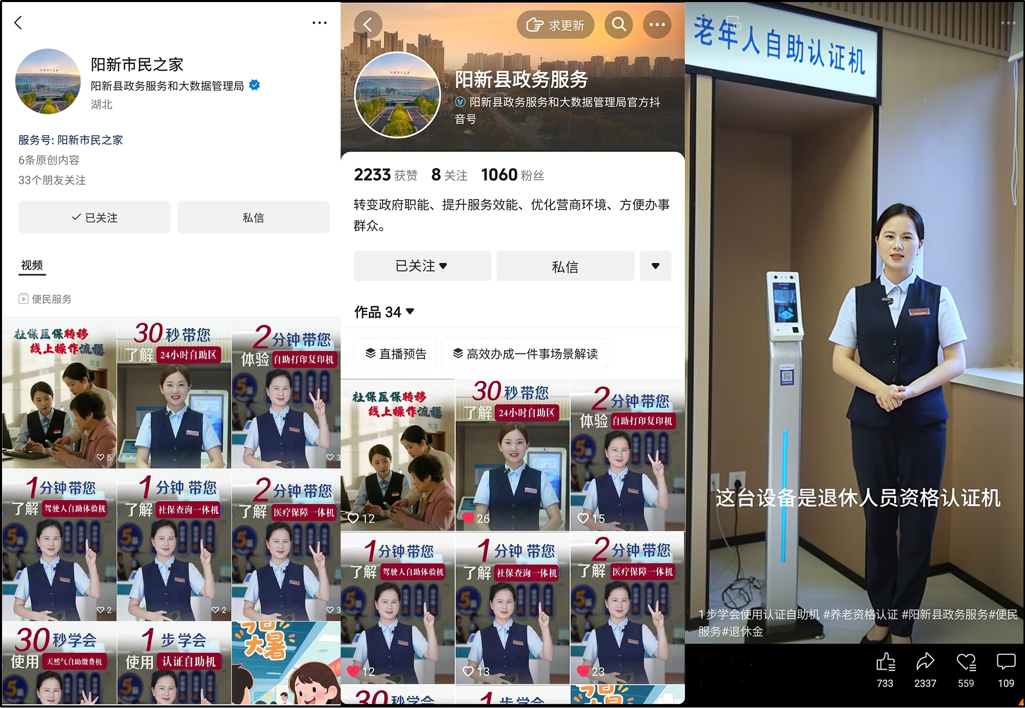 同时,为方便市民随时查看操作流程,相关自助机操作教学视频已在“阳新市民之家”微信视频号和“阳新县政务服务”抖音号同步上线。截至目前,各类自助机操作教学视频累计播放量已突破25万次,获得网民一致点赞好评,有效提升了自助服务设备的知晓度和使用效率。