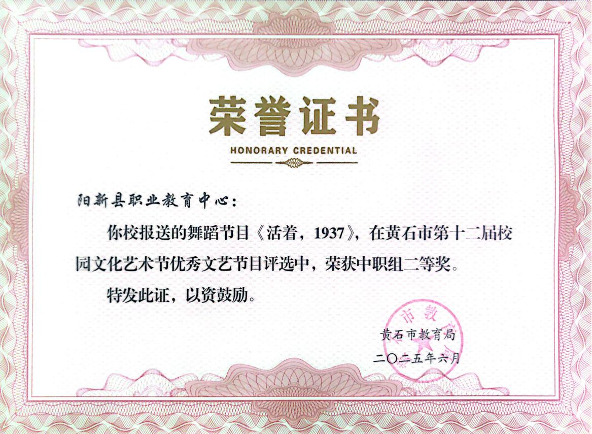 在优秀文艺节目评选中,由该校师生共同编排、精心打磨的舞蹈《活着,1937》脱颖而出,以深刻的历史内涵、饱满的情感表达与精湛的艺术表现力,分别斩获 “黄石市第十二届校园文化艺术节优秀文艺节目二等奖”“阳新县校园文化艺术节优秀文艺节目一等奖”。该舞蹈以独特的艺术视角回顾历史,传递出珍爱和平的深刻主题,在表演过程中打动了众多评委与观众,成为本次艺术节的亮点节目之一。