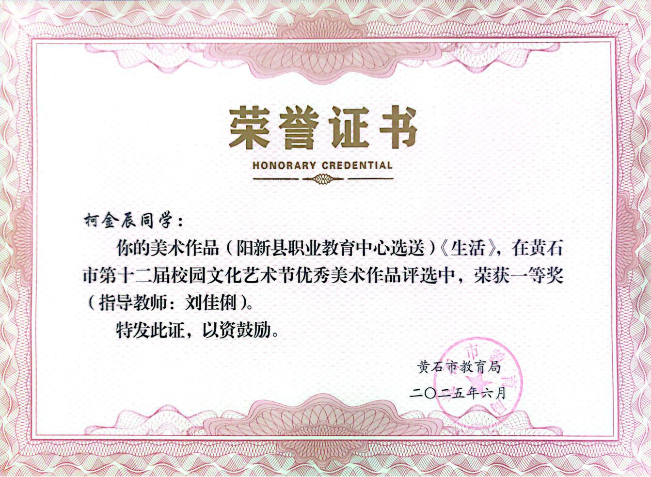 美术作品评选方面,该校学生同样表现亮眼。柯金辰同学的作品《生活》,以细腻的笔触捕捉生活中的温暖瞬间,凭借独特的创作视角与扎实的绘画技巧,分别荣获市、县“优秀美术作品一等奖”;刘佳同学的作品《绽放》,通过鲜明的色彩搭配与灵动的画面构图,展现出蓬勃的生命力,荣获 “优秀美术作品二等奖”;石海缘同学的书法作品《出塞二首・其一》,将古典诗词意境与书法艺术巧妙融合,尽显深厚文化底蕴,荣获 “优秀美术作品三等奖”。
