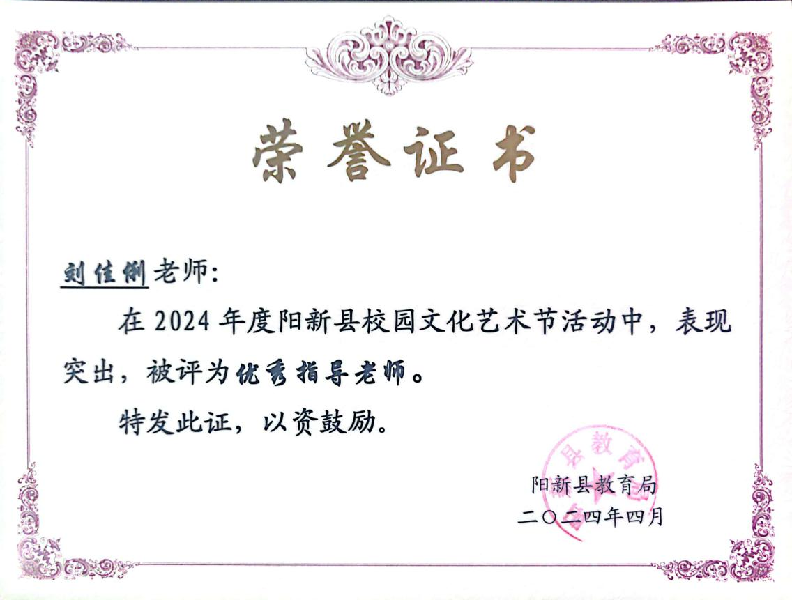 其中,该校刘佳俐被评为阳新县优秀指导老师。