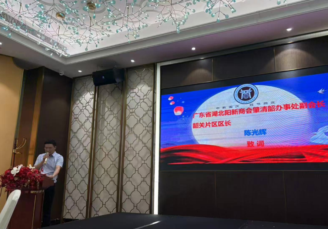 当晚 18 时,团圆会在庄严的国歌声中拉开帷幕。活动由邢宏平秘书长主持,广东省湖北阳新商会肇清韶办事处副会长、韶关片区区长陈光辉率先致辞。他指出,自办事处筹备以来,始终以 “服务会员、联结乡情、助力发展” 为核心宗旨,此次双节团圆会既是对传统节日的致敬,更是对肇庆、清远、韶关三地阳新籍人士凝聚力的深化。“无论在粤北哪座城市奋斗,‘阳新’都是我们共同的精神根脉。希望通过这样的活动,让大家在他乡感受到‘家’的温暖,为后续资源共享、合作共赢夯实基础。”