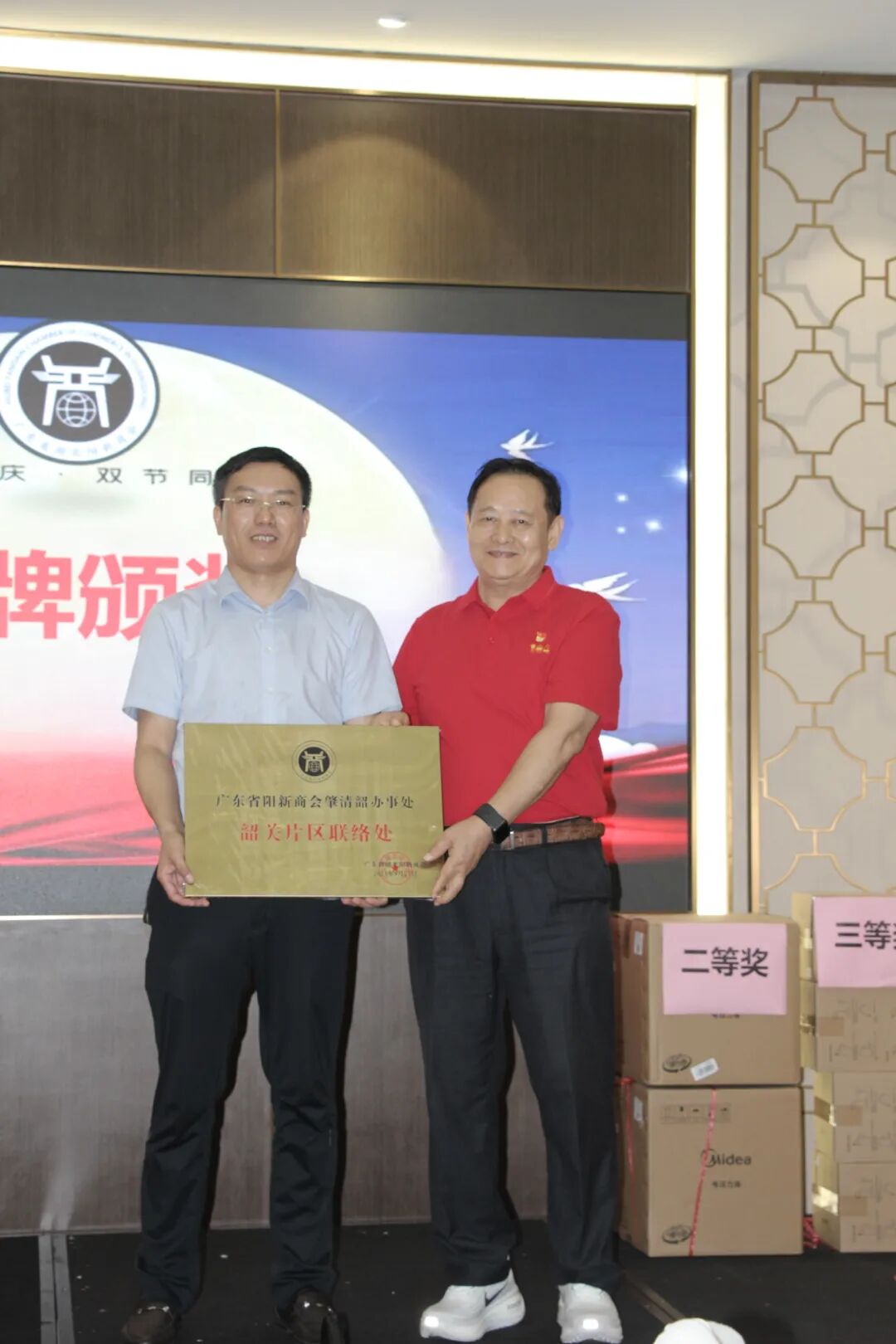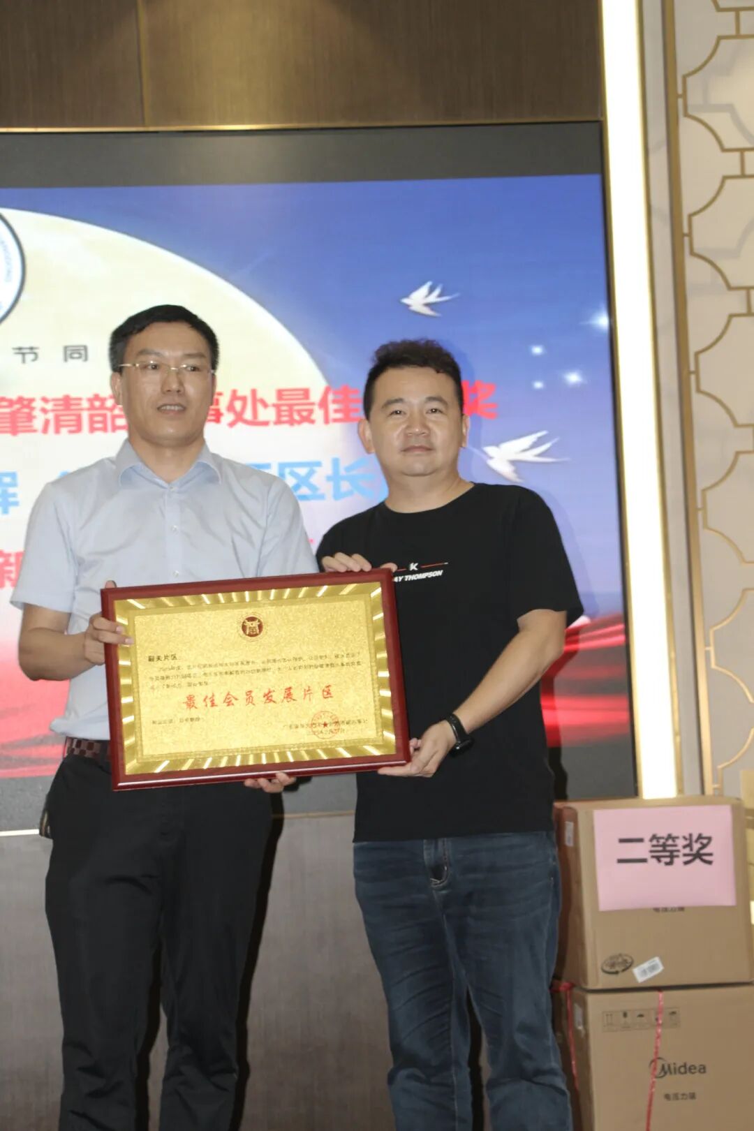 韶关片区因在会员发展、活动组织中表现突出,斩获 “最佳片区奖”,片区区长陈光辉上台领奖,由徐赐鹏会长亲自颁奖。“韶关片区获此荣誉实至名归!” 徐赐鹏在颁奖时动情说道,“陈光辉区长半年来跑遍韶关各区县,积极联络老乡入会,还牵头组织 3 场小型交流会,这份责任心与行动力值得所有人学习。希望其他片区以韶关为榜样,让三地会员网络更紧密、凝聚力更强!”