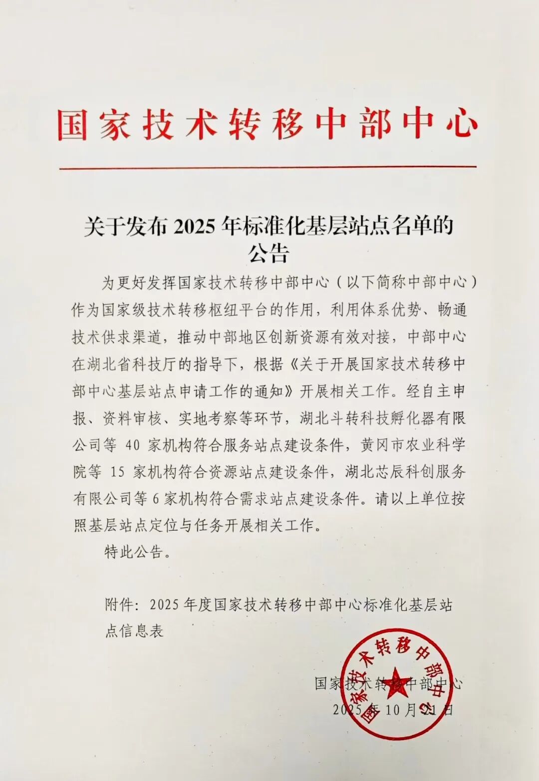 近日,国家技术转移中部中心公布2025年标准化基层站点建设名单,阳新县产业技术创新服务中心与阳新县现代农业产业技术研究院的运营主体——阳新县鑫慧农科技咨询有限公司成功入选。两家平台双双获评,标志着阳新县在科技创新平台建设上取得重要突破,成为构建区域科技创新体系、加速科技成果转化进程中的又一里程碑。