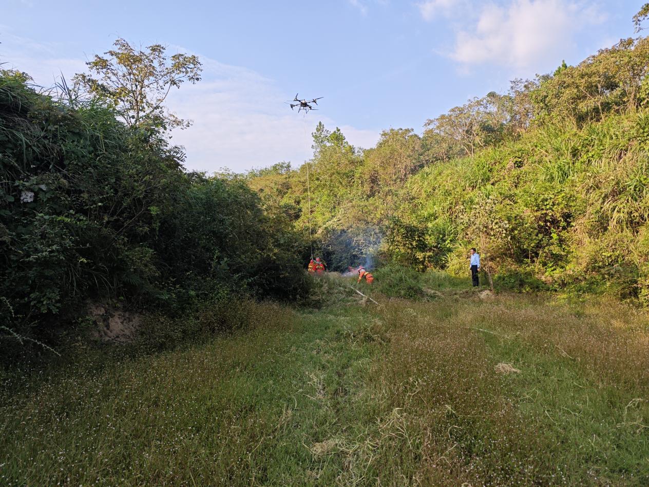 在实战演练阶段,现场模拟森林火灾,县森林专业扑火队员联合木港镇半专业扑火队员及护林员、部分村干部携带灭火装备赶往现场,队员们通过无人机将300米水管空投至火场附近,并迅速与停在路边的消防水罐车连接水管,其余队员分四组携带20台风机、三台高压水泵开展紧急施救。县森林消防专业队员手把手教会镇队员们凭借风势和火势开展全方位的扑救。现场明火扑灭后,迅速启动无人机携带水袋对火场进行清理。整个演练过程紧张有序、配合默契、处置迅速,达到了预期效果。