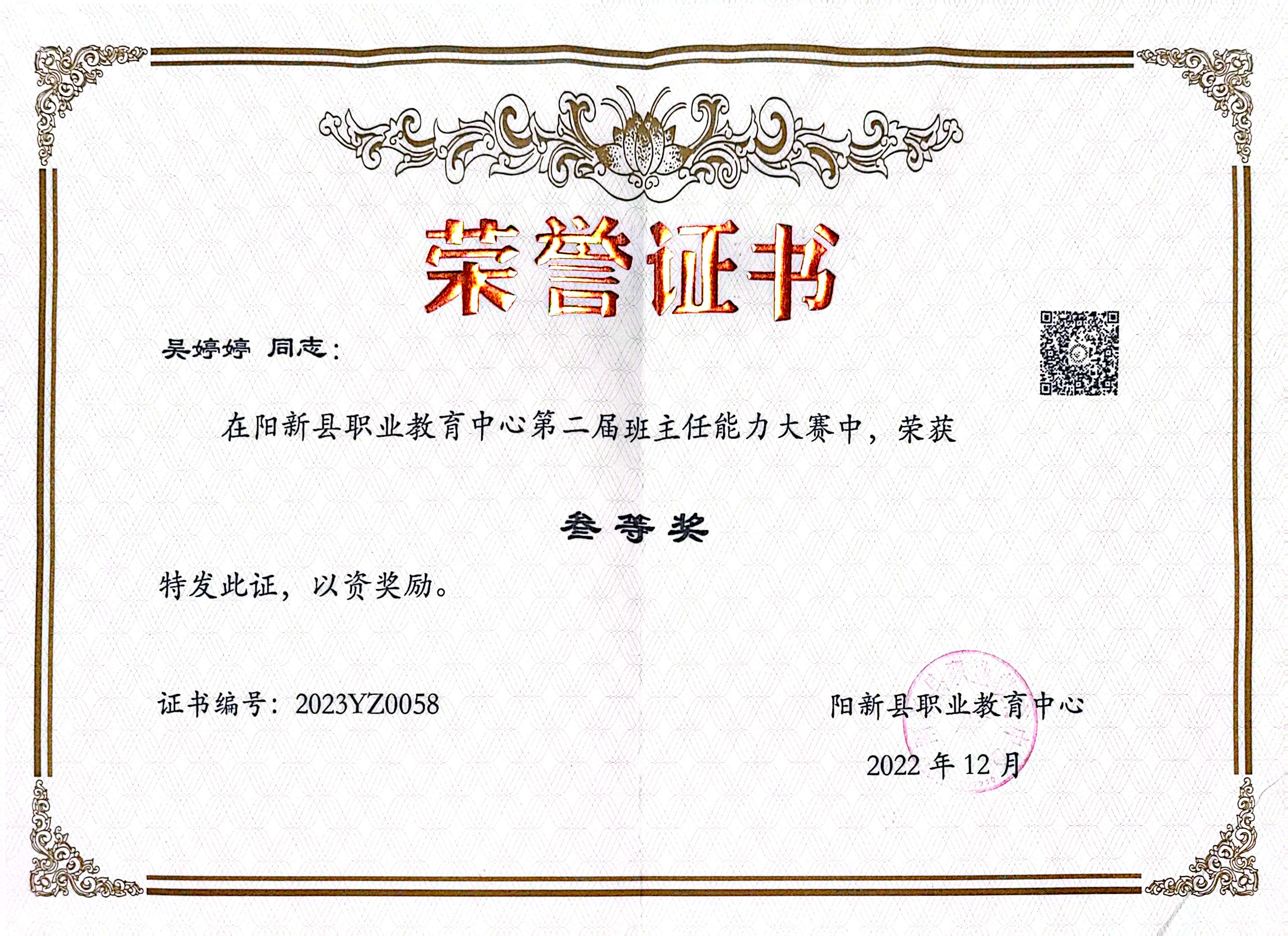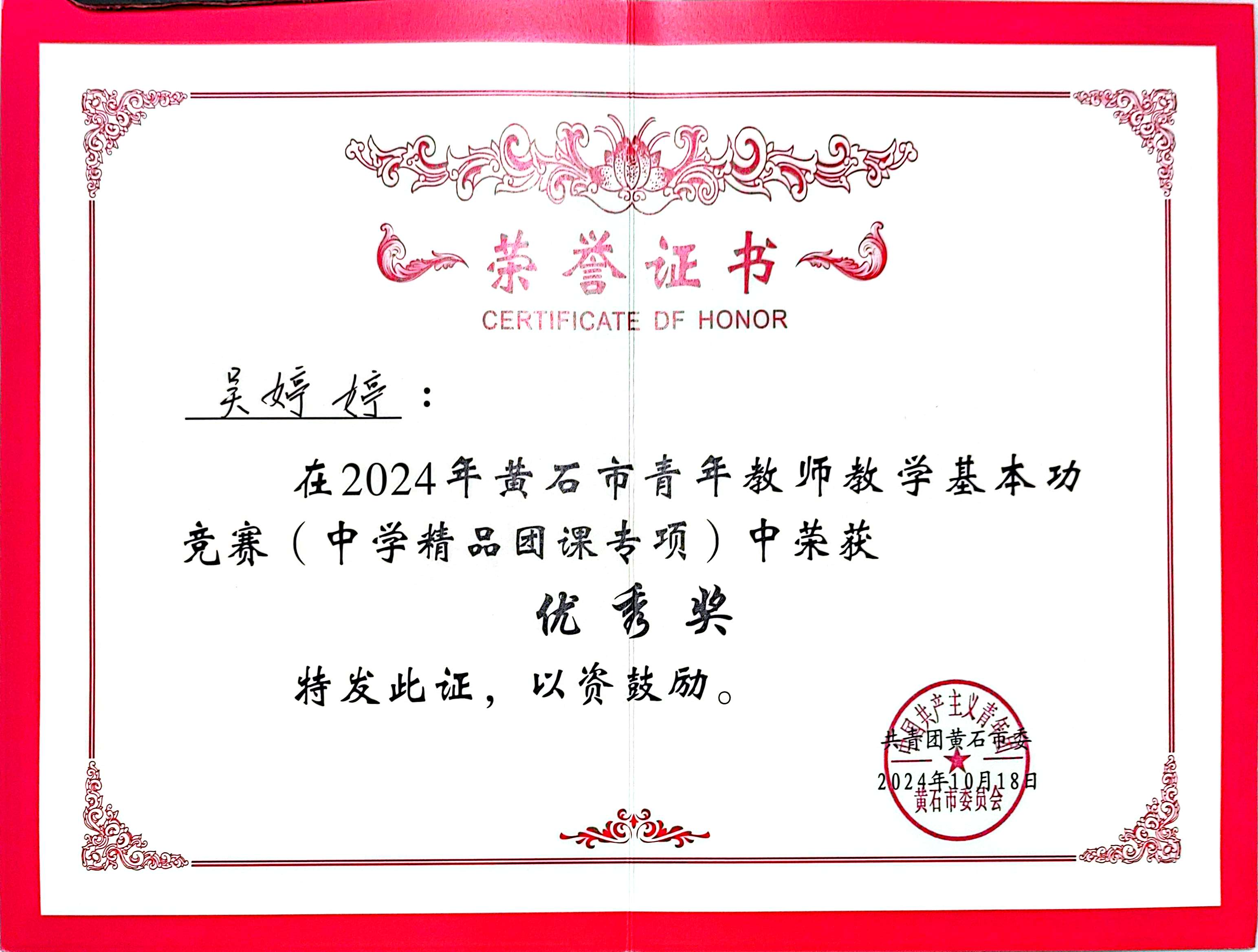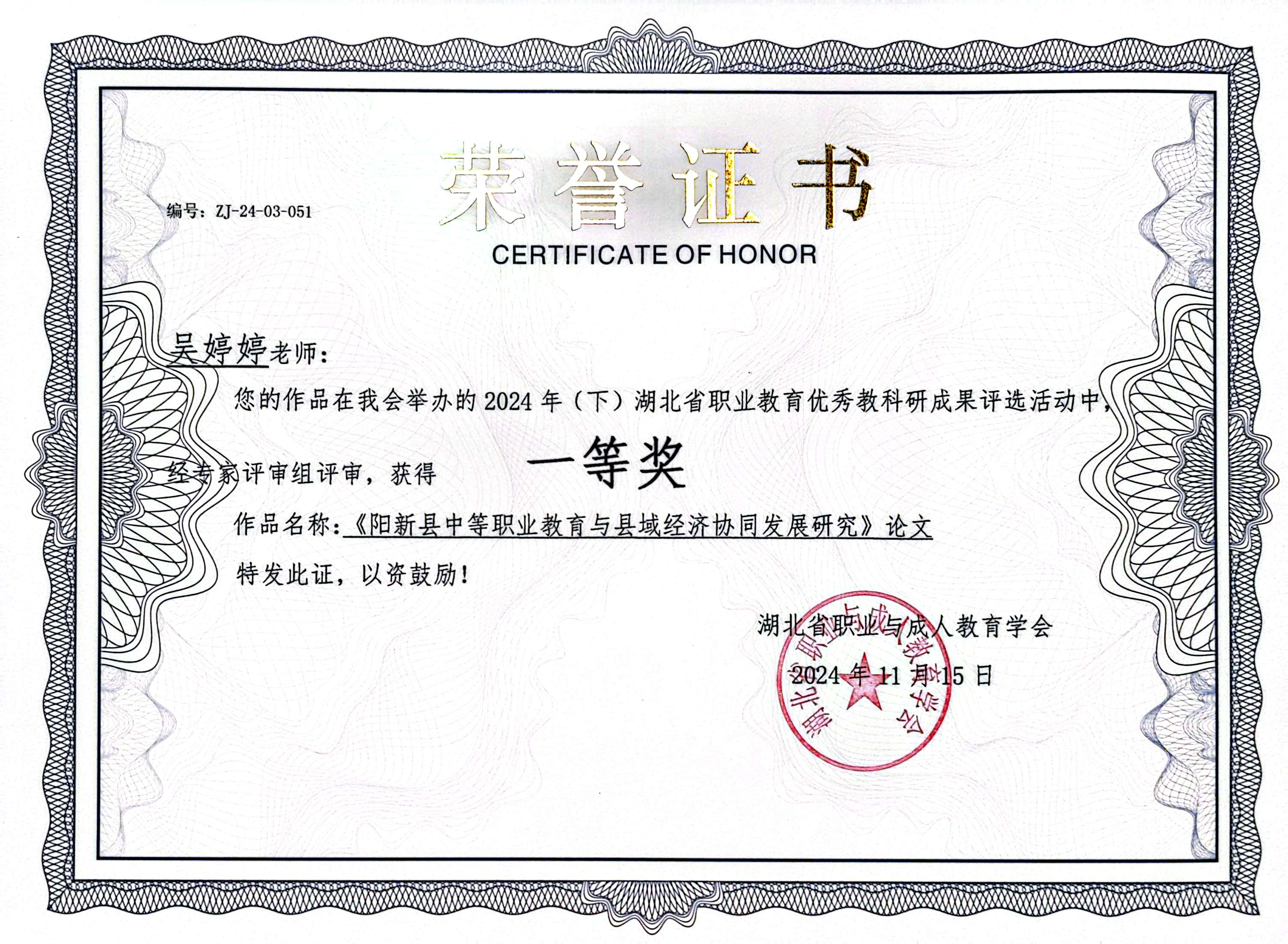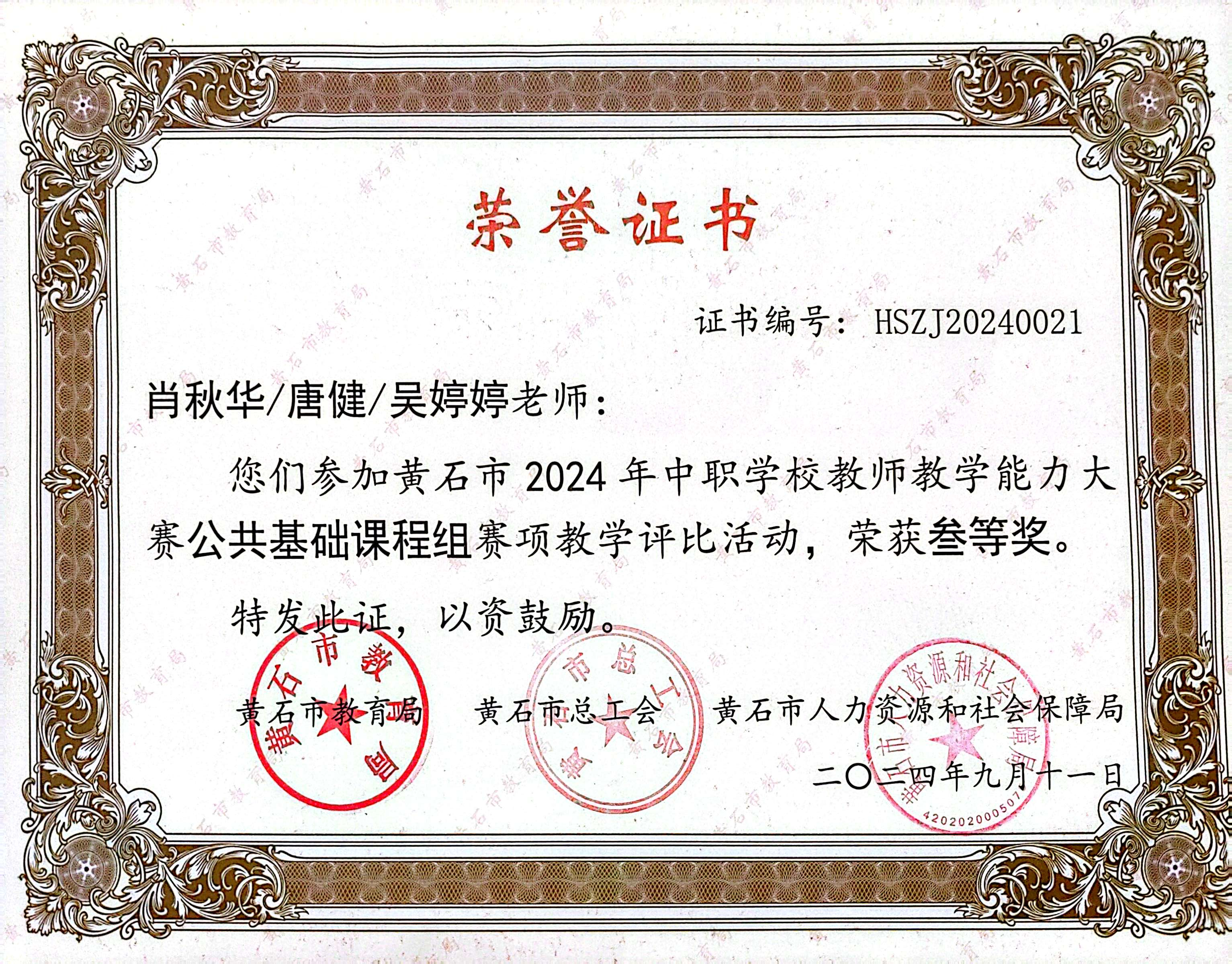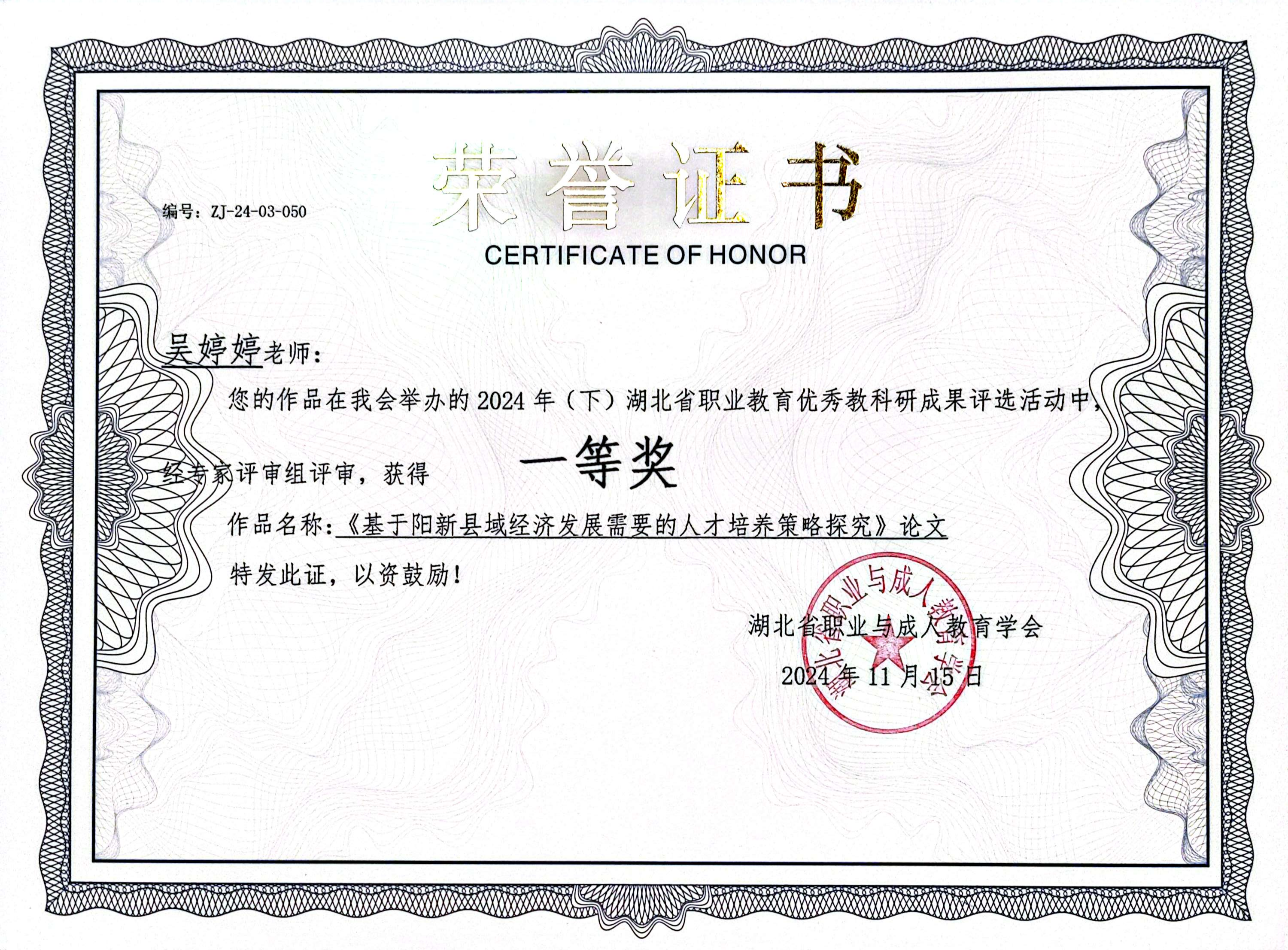 吴婷婷始终保持学习热情,不断提升专业素养和教学能力。2024年,她撰写的两篇论文在湖北省职业教育优秀教研成果评选中荣获一等奖。她积极参与各类教学竞赛,以赛促教、以赛促改,于2024年9月荣获黄石市教师教学能力大赛公共基础课组三等奖,同年10月再获黄石市青年教师教学基本功竞赛优秀奖。这些荣誉不仅是对她个人能力的肯定,更展现了新时代青年教师积极进取、勇于担当的精神风貌。