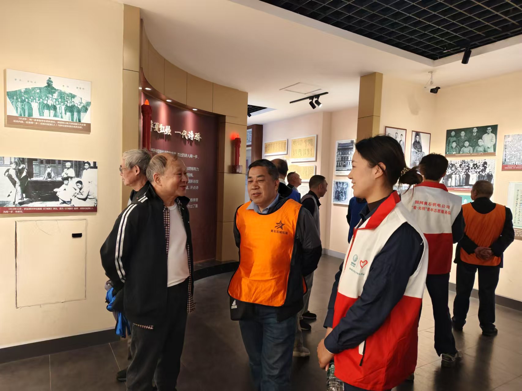 在庄严肃穆的纪念馆内,青年职工们悉心搀扶老同志,认真聆听他们讲述过往的岁月与感悟。