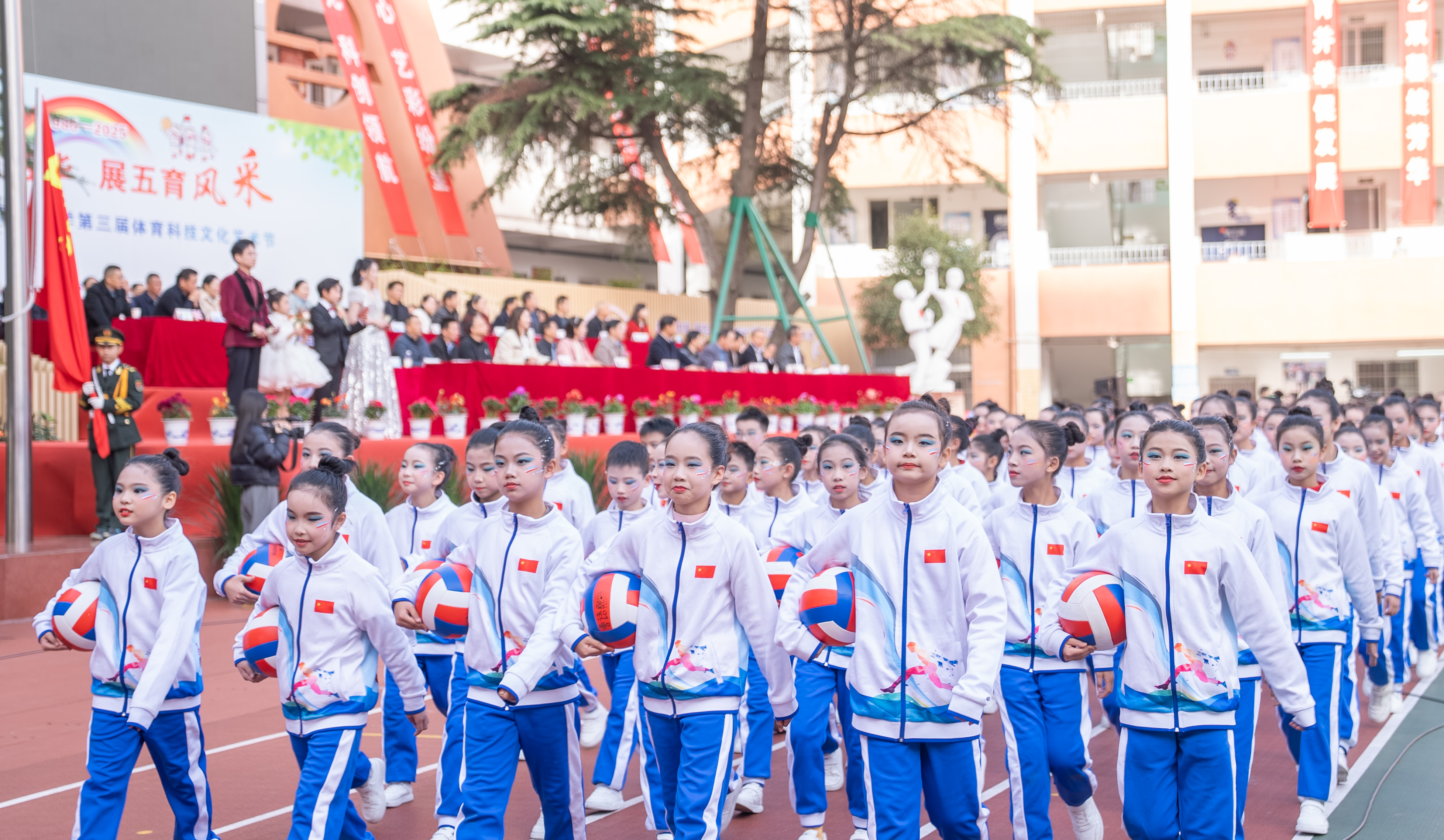 11月27日,开幕式在学校操场拉开帷幕。国旗、校旗、红旗方阵步伐铿锵,尽显少年朝气;裁判员方阵着装整齐、秉持公正初心。伴随着雄壮国歌,五星红旗冉冉升起,全体人员肃立致敬。