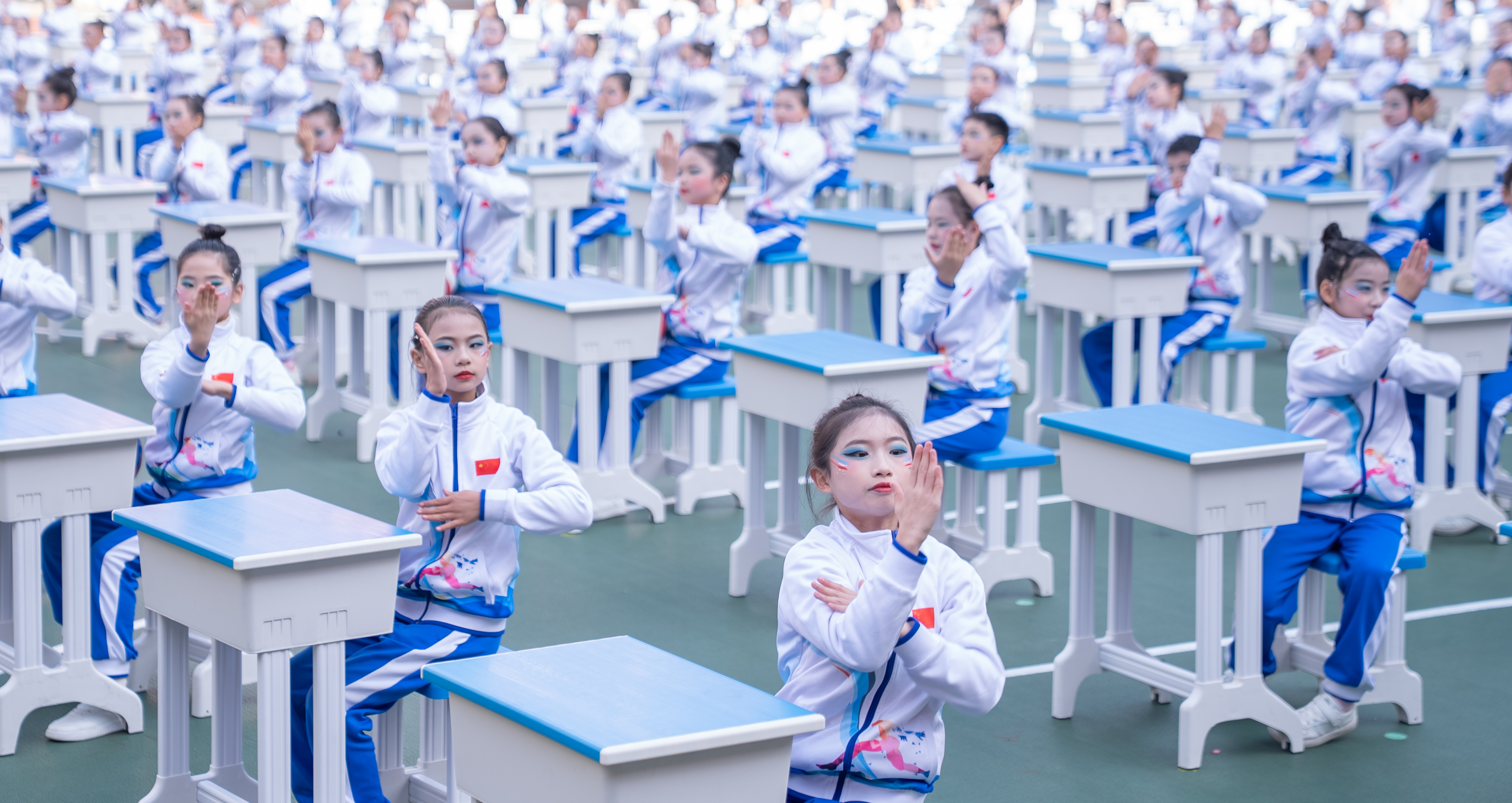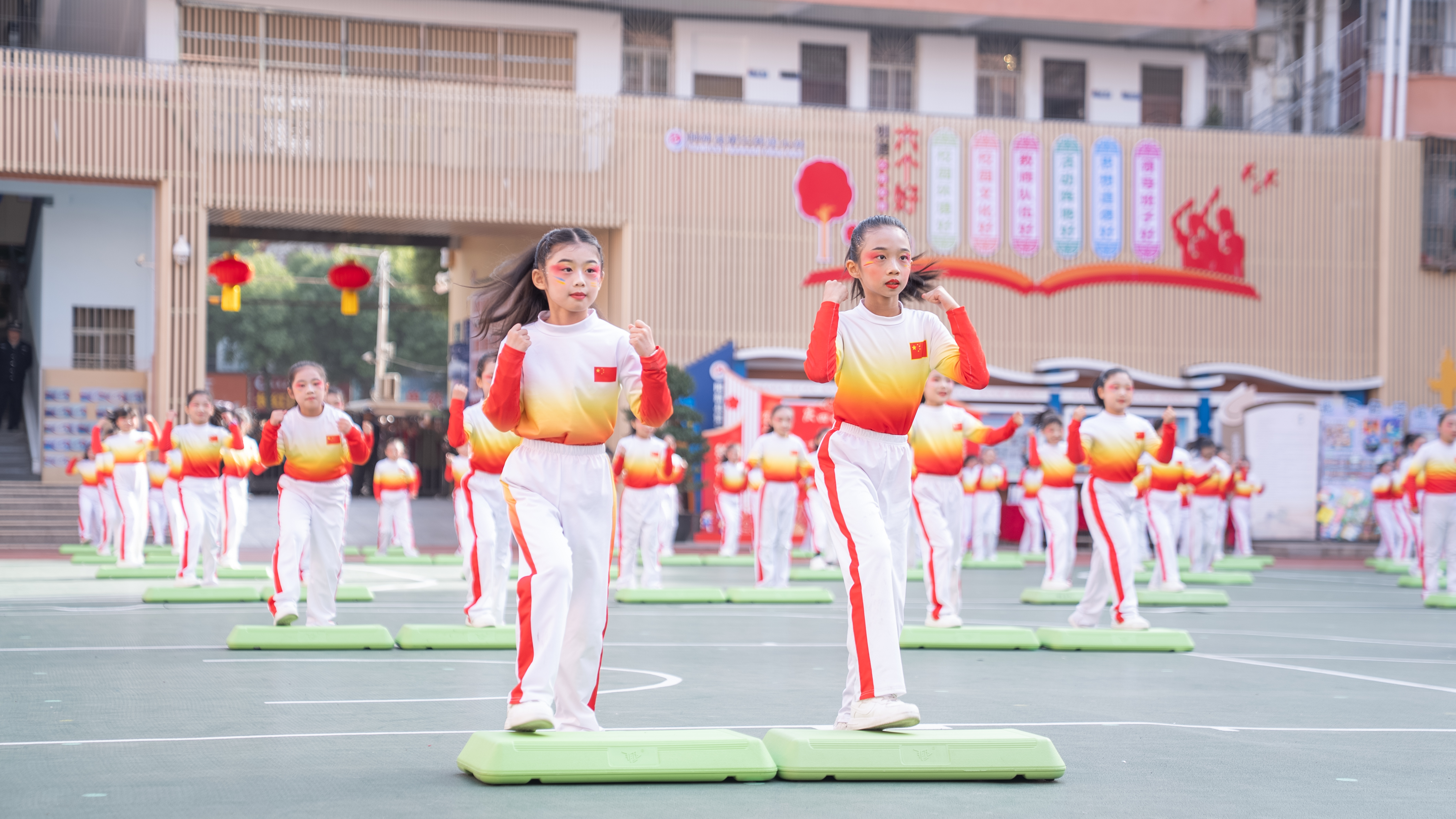 随后,团体节目展演精彩上演。五年级课桌舞《中华美少年》融传统文化与校园活力于一体,四年级踏板操《跃动的彩虹》节奏明快、协作默契,二年级科技舞蹈《AI的陪伴》创意新颖、童趣盎然,六年级流星球《火流星》光影灵动、惊艳全场,三年级跑操《逐梦四十载,青春正当时》以整齐队列致敬校庆,赢得全场掌声。